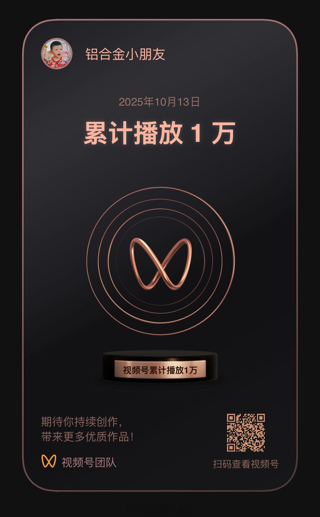 铝合金小朋友视频号目前累计播放已经突破一万,里程碑庆祝下[打call][打cal