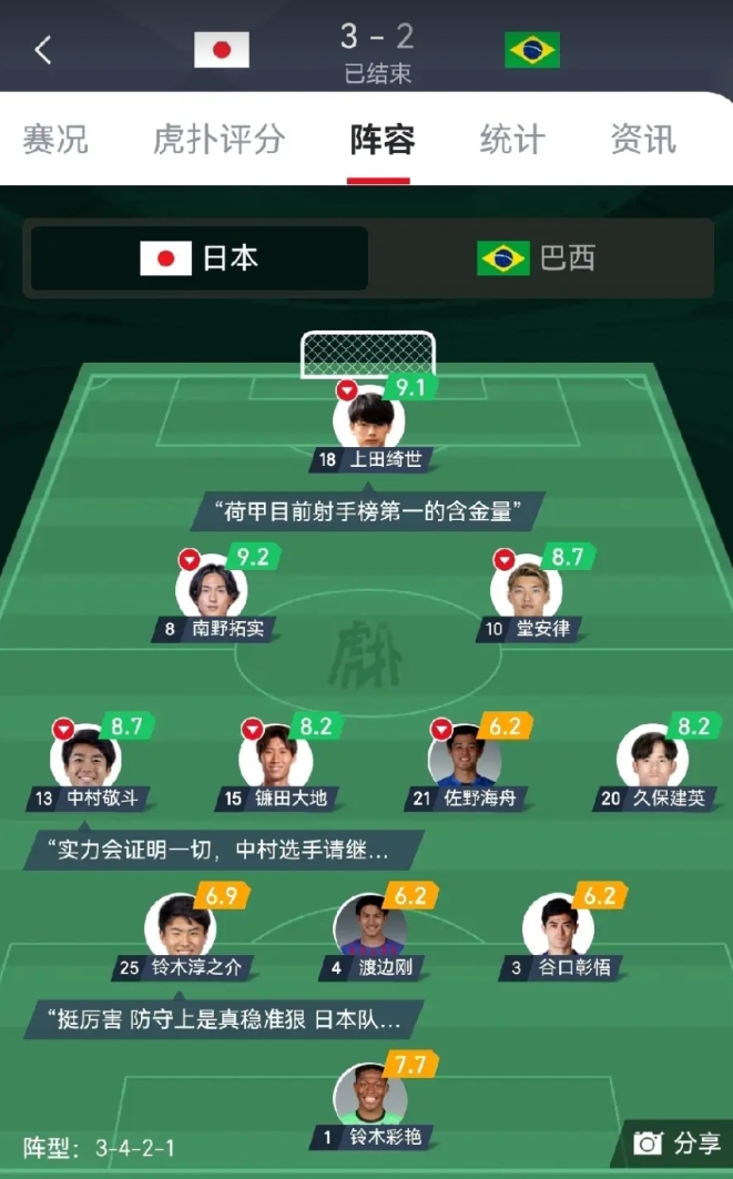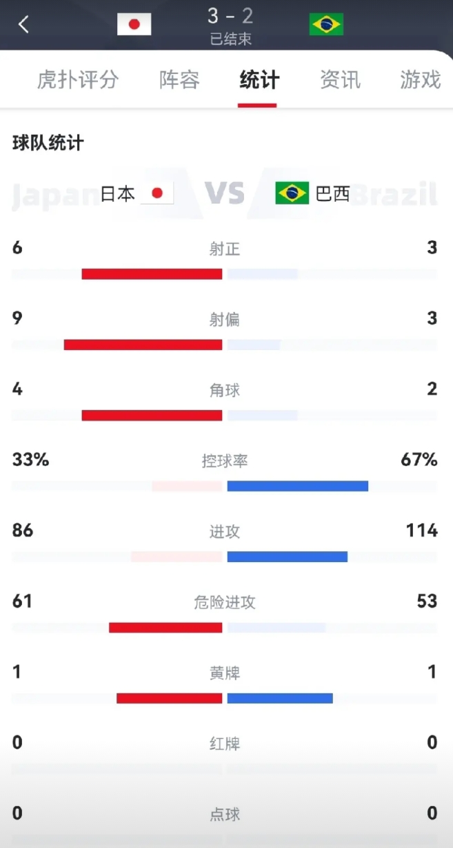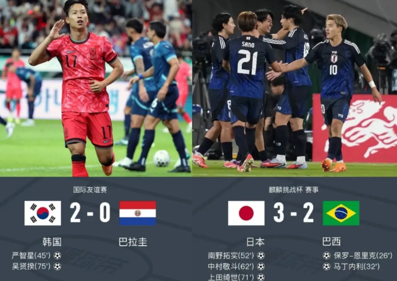 话说这南美足球也不是你们吹的那么厉害呀!日本居然3:2把巴西干翻了,那边韩国也2:0完胜巴拉圭。 这两场我都看了直播,日本上半场场面就不逊色于巴西队,但是巴西两次秒传就进了俩,我以为日本要崩盘了,没想到下半场直接逆转了。 而韩国队,整场比赛占据优势,和踢巴西那场的状态完全不一样。 这么看韩国队还是有世界杯16强的实力,而日本队现在的实力应该能有世界杯8强的水平了。 至于巴西嘛,我估计顶多也是世界杯八强的水平了。