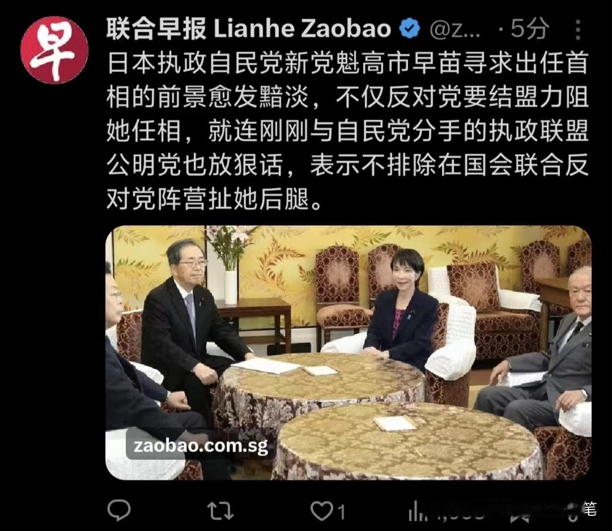 联合早报报道:日本执政自民党新党魁高市早苗寻求出任首相的前景愈发黯淡,不仅反对党要结盟力阻她任相,就连刚刚与自民党分手的执政联盟公明党也放狠话,表示不排除在国会联合反对党阵营扯她后腿。 评:高市早苗从当选自民党总裁的欣喜若狂到现在被现实狠狠打了一巴掌。本以为可以坐自民党总裁望日本首相,享受日本历史女性第一人的美誉,没想到现在阻力越来越大,近在咫尺的首相梦越发难以成真了。这是日本政坛的内斗体现,也是日本政坛对于一个极度反华政客掌权的忧虑反映。总的来说,高市早苗如果不能当选日本首相,那是日本的万幸。