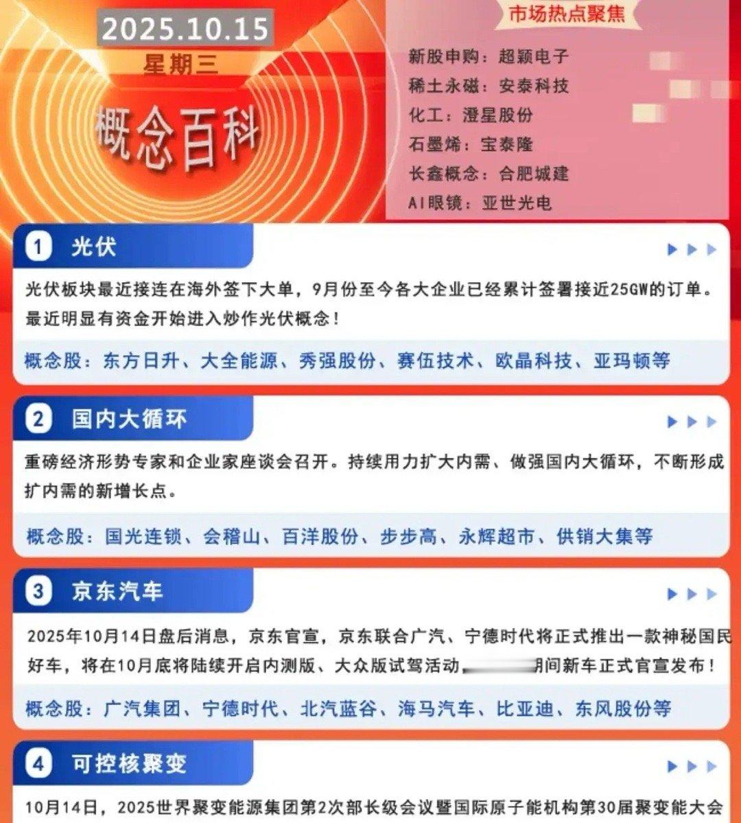 当前市场热点围绕“光伏海外订单、国内大循环扩内需、京东汽车生态、可控核聚变技术”四大主线展开,光伏板块受益于海外需求爆发与资金炒作,国内大循环板块承接消费升级与内需激活红利,京东汽车板块依托新车发布打开产业链增长空间,可控核聚变板块则受技术会议催化获得长期关注。相关个股凭借在产业链的业务卡位,分别承接各板块的需求与政策红利,短期可关注订单兑现与事件催化节奏,长期则需跟踪产业技术突破与内需增长的持续性。