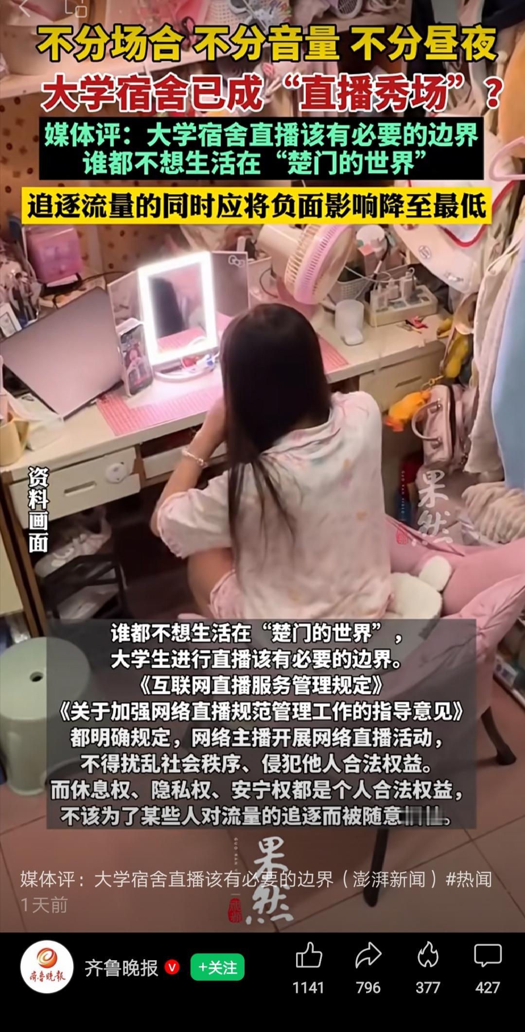 “网红”赛道太拥挤了。 大学生在不影响学业的情况下,搞直播没有问题,但如此不分昼夜,不分场合,甚至不顾宿舍同学的隐私(或者就是以此为卖点),能长久吗?
