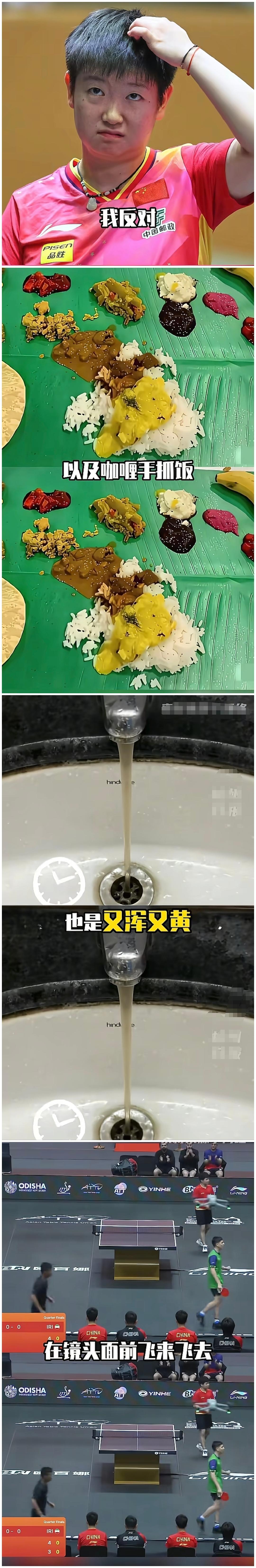 印度举办世锦赛这脸都丢大了 比赛正在热火朝天的打着,直播比赛时突然天降无人机在那飞来飞去,解说都给整懵了,现在好了,全世界都看到印度人口大国的笑话了 王曼昱在热身的时候,以为是滴水在地上,弯腰拿纸巾去擦干净,没想到居然是鸟屎,边上的孙颖莎都看呆了 之前在球员们在准备的时候,边打球边施工的场地,电线都还没装好,没有空调热得一个个头发像条形码一样,队员们拿冰海盖头上降温,尤其是日本队员演都懒得演,一脸的不开心,但他们都在用力坚持着运动精神,可最后阿三哥更是的芭蕉叶搭配抓饭才把我看呆了,没有碗筷刀具,好食材得用手抓才行,印度婚宴果然不一般,就这水平还想申请奥运会,如果印度举办奥运会,那笑点槽点应该数不胜数了! 印度乒乓球赛 印度乒乓球 王曼昱 国乒印度 印度亚锦赛 印度乒乓球队 印度队世锦赛 印度世锦赛
