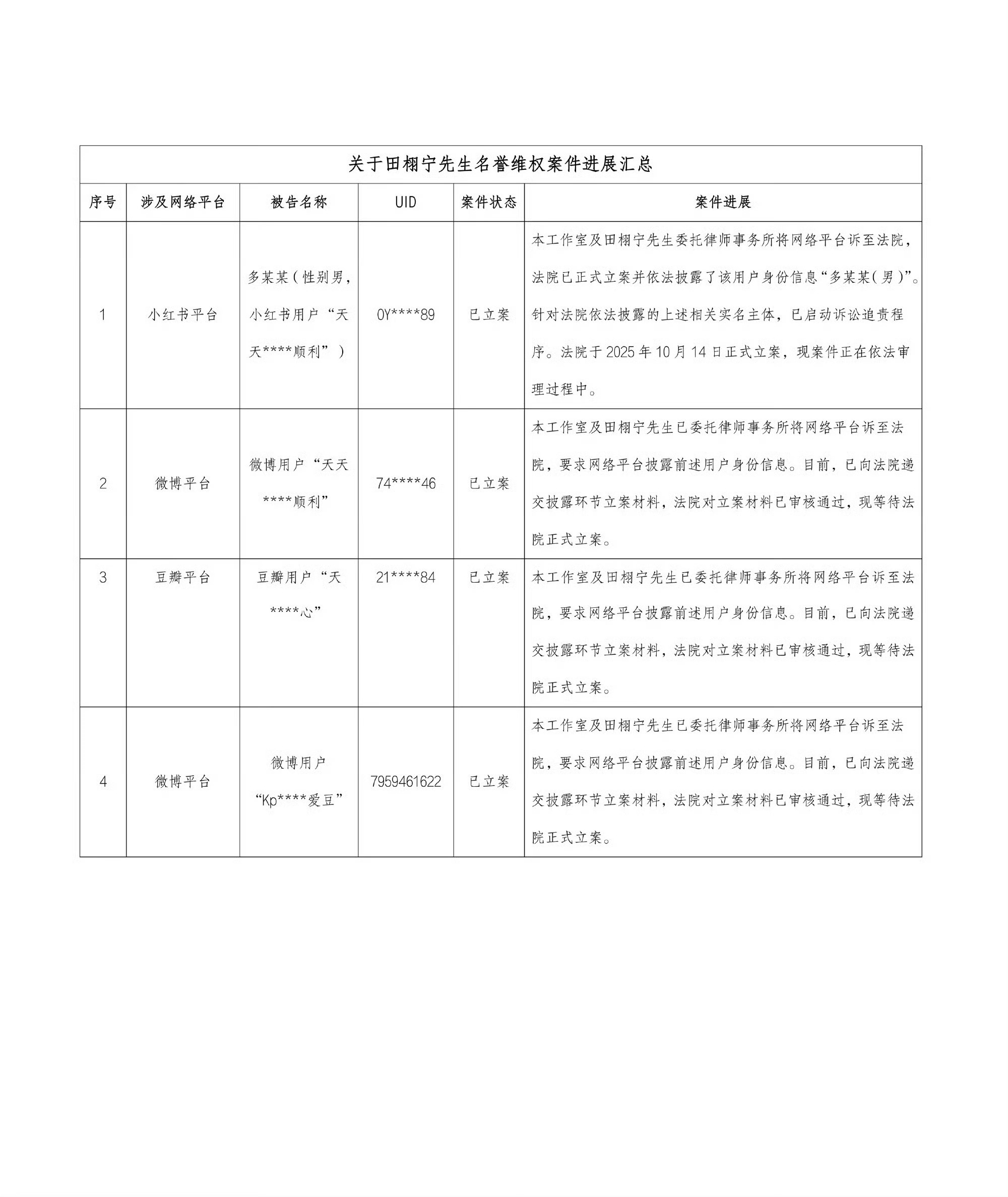 田栩宁工作室公示告黑进度