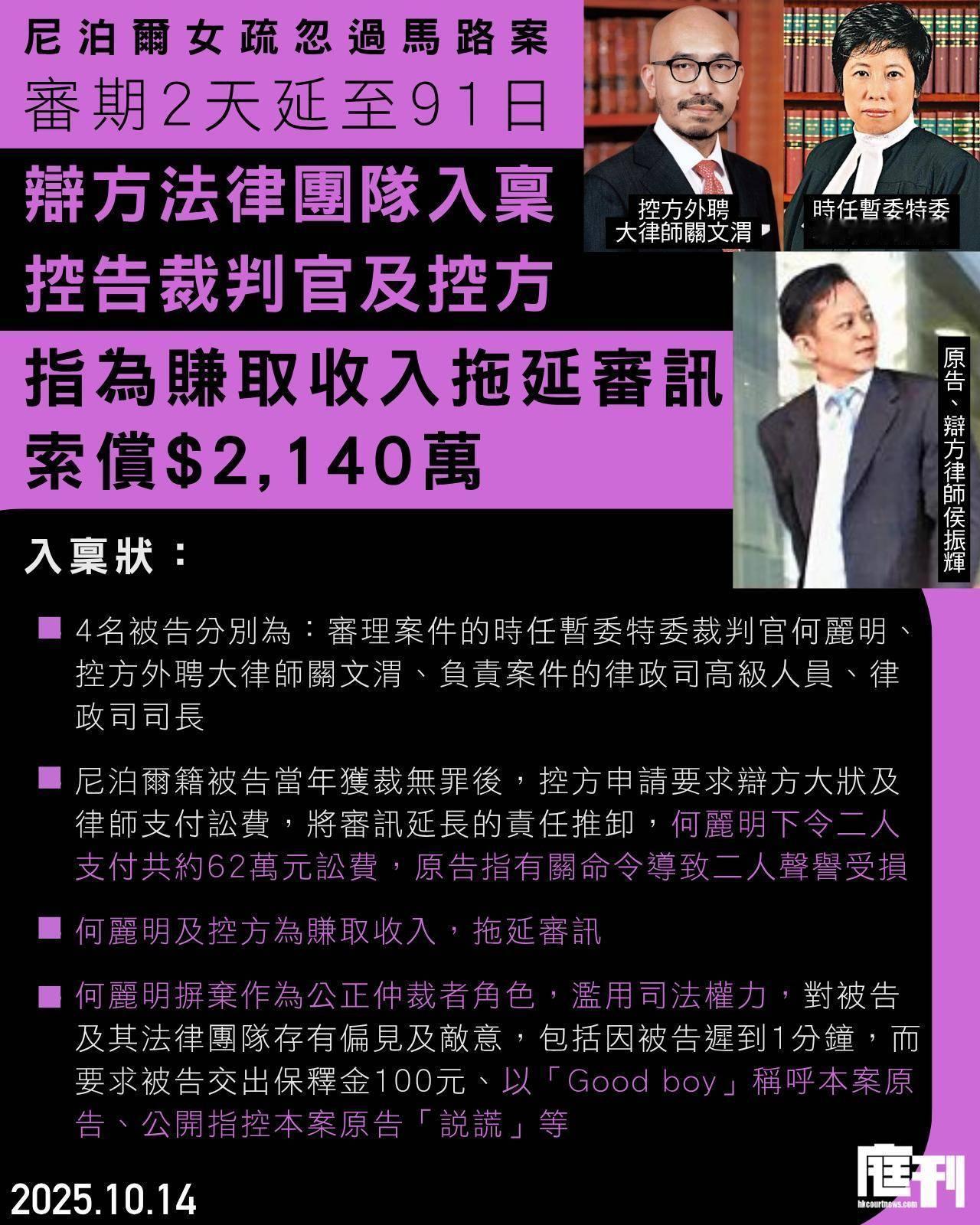 2018年,一名尼泊尔籍女子乱过马路被检控,然而,她在庭上否认指控,而后开始长达20个月的审讯。 当时为了打赢这场官司,港府聘请了大律师,然而原本只需2天的审讯,最后却在20个月内审讯了91天,在一番激烈的辩解后,最终该女子获判无罪。 而后,当时审理这个案件的裁判官何丽明,裁定代表该女子的大律师梁耀祥及律师侯振辉需支付讼费约62万元,对方表示不服上诉而后撤销。 几年过去,大律师梁耀祥及律师侯振辉在前天入禀高等法院,控告当时裁判官何丽明、审讯时控方外聘大律师和律政司司长等。 他们剑指何和外聘大律师为赚取更多收入,拖延审讯,更把责任推给梁侯二人。他们又指,事件严重损害其专业声誉,亦令他们饱受困扰,因此索偿2140万元。 这里还有个小插曲,话说尼泊尔女子被判无罪,而后向当时的香港律政司司长郑若骅以及两名控方外聘大律师、两名警务人员提出恶意检控,索偿不少于600万元。 最后在高院法院,法官欧阳桂颁下判词,指原告的申索是无理取闹及琐碎无聊,故下令剔除这宗索偿诉讼,更下令原告支付共逾90万元讼费给5名被告。