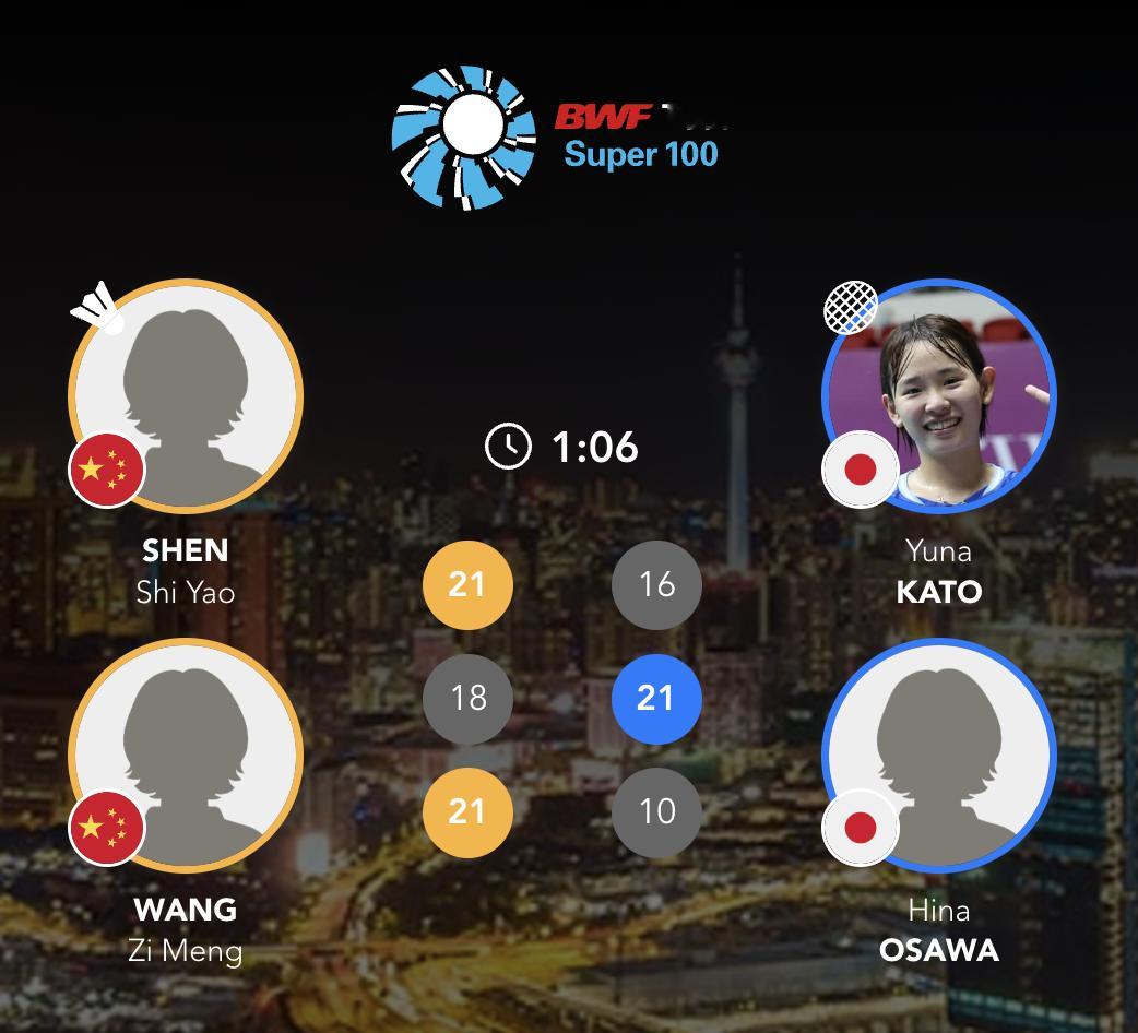 沈诗瑶/王子萌🇨🇳21-16、18-21、21-10🇯🇵加藤佑奈/大