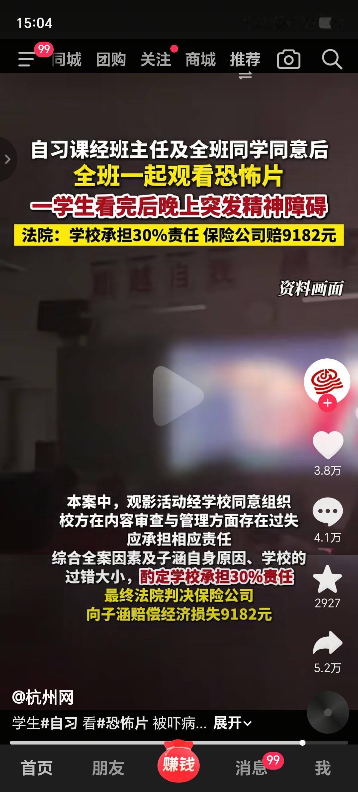 最近有一个中学班主任组织全班同学看恐怖电影,也是为了“活跃班级氛围”,谁知道一个学生看完恐怖电影当晚就不对劲了,开始出现幻觉、失眠、情绪失控等症状,经精神科医生诊断为急性应激性精神障碍,这可不得了,孩子父母养了14年的养的好好的孩子出了这么大的事情,气愤伤心又绝望,直接找学校理论去了。 孩子妈妈回忆,孩子当晚回家后反复念叨“电影里的黑影在追我”,不敢独自待在房间,夜间频繁惊醒并尖叫。第二天被孩子父母送去医院检查,医生判断孩子因接触强烈恐怖刺激,超出心理承受阈值,诱发急性精神障碍,需住院观察治疗。家长直接联系孩子班主任,对方说当时认为“电影只是娱乐,其他同学都没事”,没有意识到问题的严重性,直到学生家长提出书面投诉,学校才开始介入调查。 据说电影里含有血腥、暴力镜头,而且放恐怖电影前老师自己没看,也没跟家长们商量,班级里还有3个孩子有轻微失眠,不敢走夜路的情况。 最后因为是孩子自己同意看的,没拒绝,学校赔偿了30%,也就是9182元。