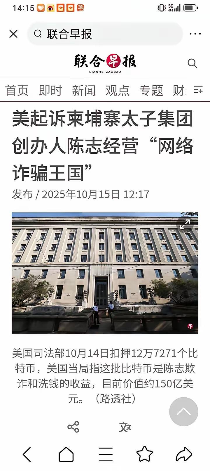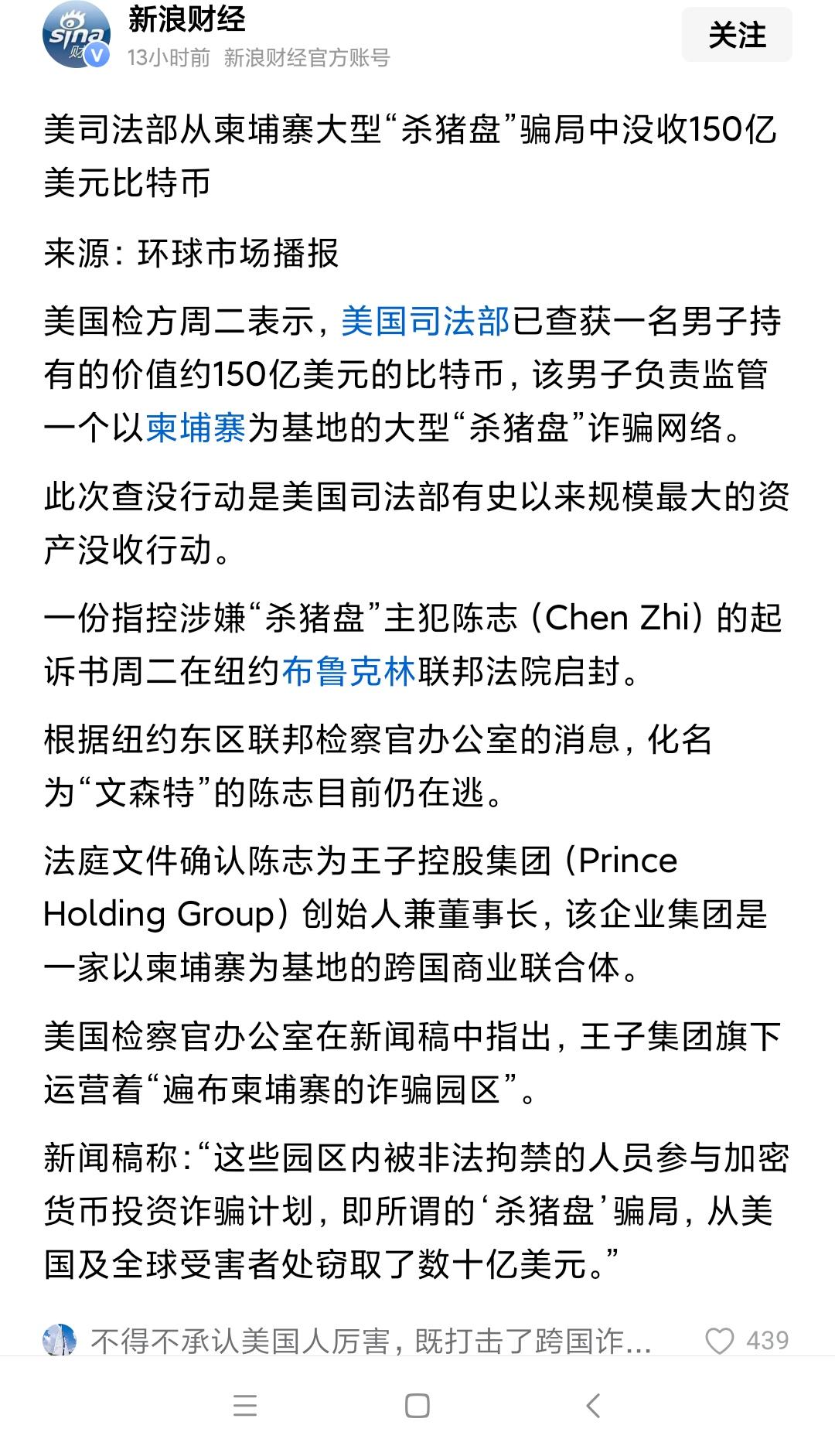 美国和英国在今年10月14号发布联合行动,起诉柬埔寨太子控股集团老板陈志,宣称陈志为诈骗集团首脑。 美国还要没收陈志诈骗来的一大笔钱,约12万枚比特币(现值为150亿美元左右)。这笔钱目前已由美国政府接管。 英国也查封了陈志在英国的众多别墅。 陈志这个人若干年前就是有问题的。我国南方都市报早在几年前就报道过他,截图如下。 既然已经发现了他有问题,为什么不追踪呢?现在让老美没收了他那么多钱。100多亿美元,不是个小数字。 不过老美也是太岁头上敢动土,陈志是柬埔寨的掌门人洪森亲王的顾问。 老美和英国也不想想,不看僧面看佛面,不看鱼情看水情,没有看在洪森亲王的面上饶了他。