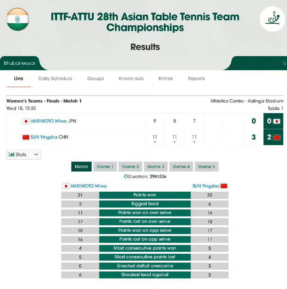 国乒女团vs日本一单孙颖莎干脆利落3-0零封🇯🇵,比赛还在继续,中国队🇨🇳加油!孙颖莎3比0张本美和