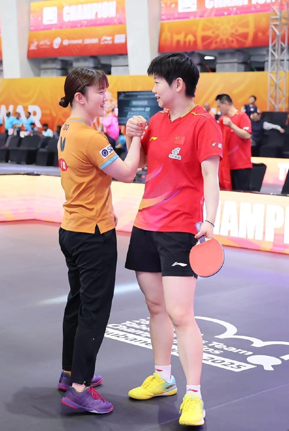 乒乓赛场的“英雄相惜”!孙颖莎与大藤沙月的互动太有戏 当孙颖莎和大藤沙月握手时,这“扳手劲”式的互动也太可爱了!曾经大藤还说着有机会赢,如今却直言孙颖莎是榜样、是偶像,妥妥被打服后从心底里的敬佩。赛场上是对手,赛场下是彼此欣赏的朋友,这种竞技体育里的英雄相惜,谁看了不说一句绝!孙颖莎