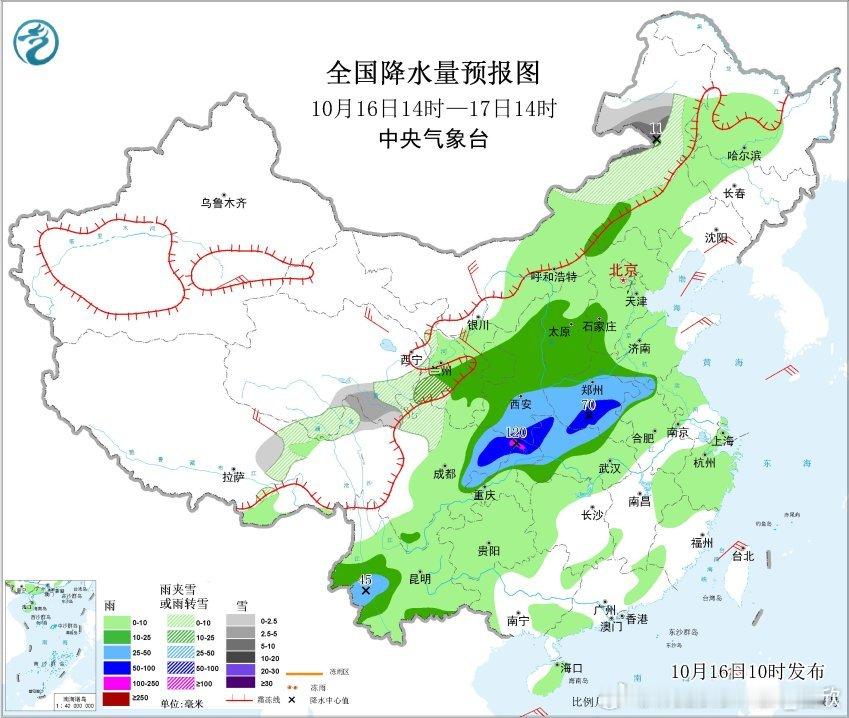 预计,10月16日14时至17日14时,四川东北部、重庆西部和北部、陕西东南部、湖北西北部、河南大部、安徽北部、江苏西北部以及云南西部等地部分地区有大到暴雨,其中,四川东北部、重庆北部等地局地有大暴雨(100~120毫米)。此外在内蒙古中东部还会出现降雪。