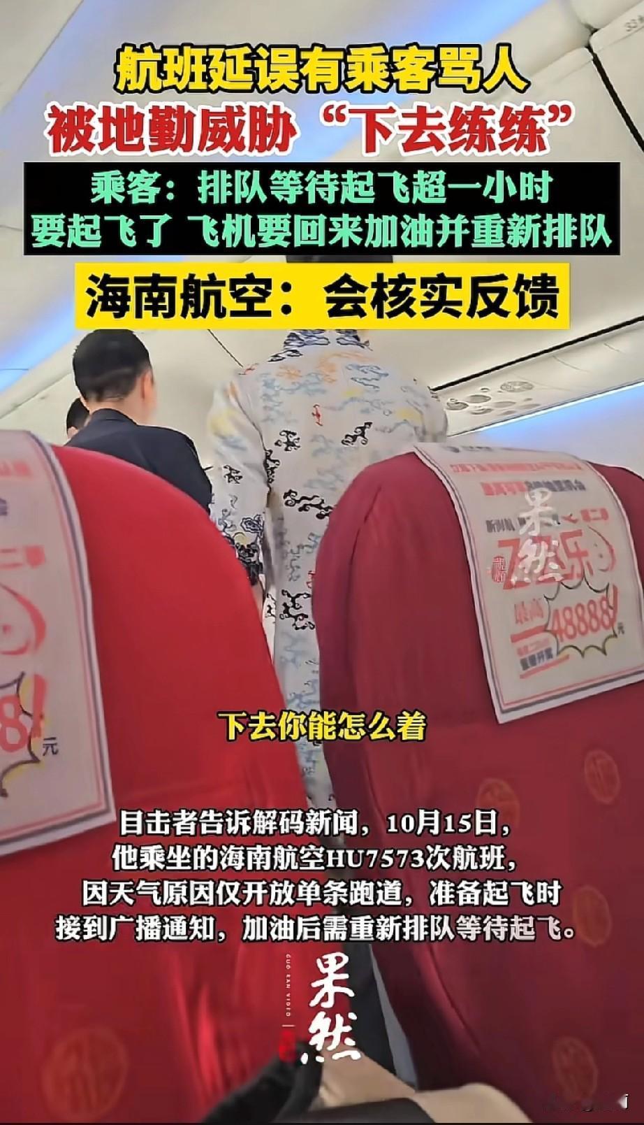 10月15日,海南航空HU7573次航班从西安咸阳机场飞青岛,因大雾仅单条跑道可用,排队一个半小时后准备起飞,却通知要滑回加油且需重新排队。 部分乘客情绪激动骂了脏话,空姐叫地勤登机说明。地勤上来就跟三名老人说“你们到底想不想飞,不想飞跟我下来”,被指语气挑衅威胁。 海航回应称大雾致延误,航班有滑回记录,但滑回和争执细节还在核实。 乘客等久了闹情绪能理解,但骂人确实不对。地勤是来解决问题的,这种带火药味的话只会激化矛盾。航班延误难免,双方各退一步好好沟通,比互呛管用多了。
