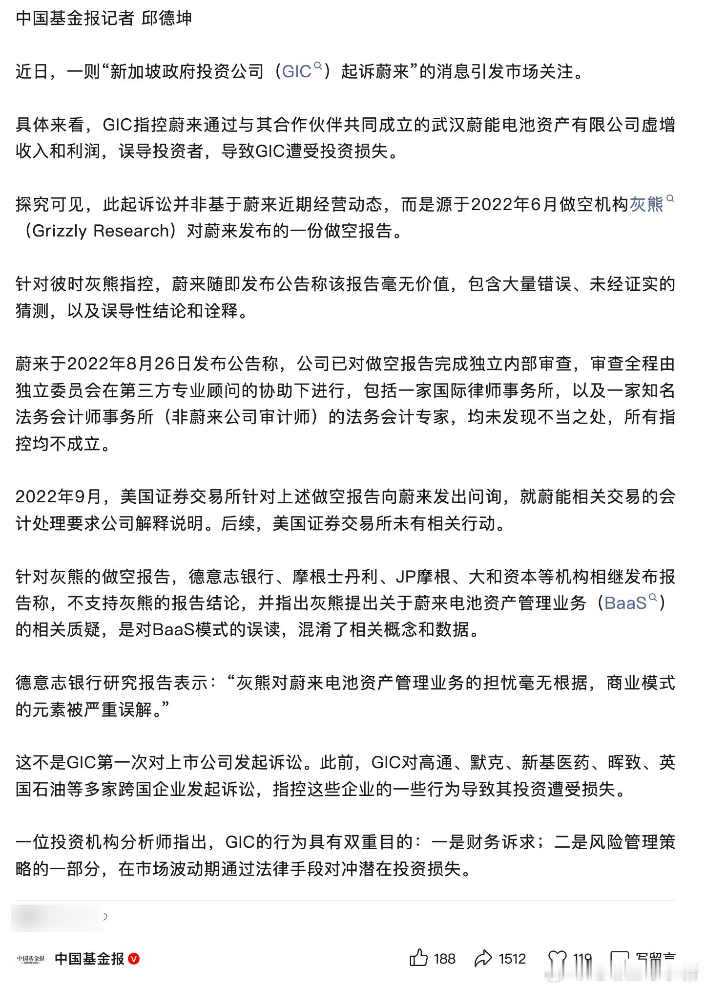 来看看中国基金报的报道:这不是GIC第一次对上市公司发起诉讼。此前,GIC对高通、默克、新基医药、晖致、英国石油等多家跨国企业发起诉讼,指控这些企业的一些行为导致其投资遭受损失。
