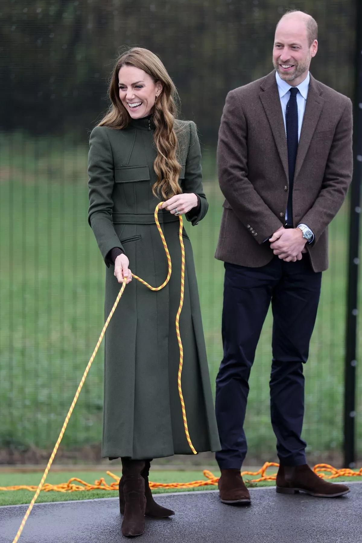 这对夫妇见到了两位18周培训课程的最新毕业生,消防员皮亚赖斯·麦卡弗里和凯姆·麦克尼西,听他们讲述在50英亩的乡村培训地点的培训经历。 世界一流的设施包括一个洪水救援模拟器——这是全球仅有的两个之一,位于消防服务培训设施中。 在仓库外观看水管训练后,威廉和凯特登上了消防车,前往那里观看模拟洪水救援,并在岸边安全地带参与训练。 每个人都试图抛出带有浮标的绳子去救援一名“受害者”,由一名教练扮演,但由于水流湍急,未能成功抓住他。 威尔士王妃穿着亚历山大·麦昆的绿色大衣和詹文托·罗西的靴子,还开玩笑说她和王子在消防车上想要打开“警报器”全速行驶。 据新晋级的消防员凯特·麦克尼克斯 称,在短暂的训练场穿越过程中,凯特“想要开启警报器”,但司机“被明确告知不行”。她补充道:“她希望王子开车,但司机还是安全地把我们送到了。” “凯特说,‘我很想以真正的速度驾驶,并开启警报器,’但他们已经到达了水上救援区域,这只是一点开玩笑。”25岁的凯姆希和她的同事皮拉伊斯,32岁,在六月毕业后被选中与皇家访客共度时光。 “他们都是可爱、伟大、脚踏实地的人。向他们展示我们的学习与发展学院非常棒,他们对此感到非常惊讶,”皮亚拉伊斯说。他说威廉和凯特“非常真诚和感兴趣,尤其是关于水设施方面。”