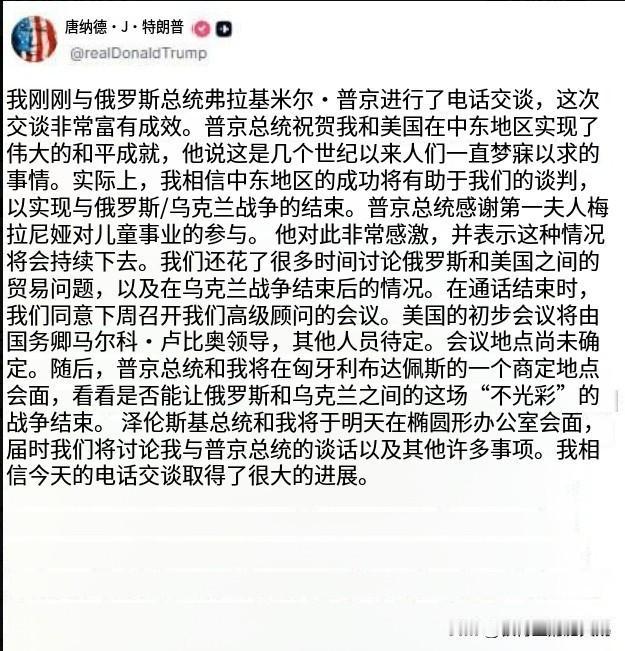 亲切又友好 在见泽圣之前,特朗普先给普京打了电话。 探口风,征求意见,达成一些共识。 特朗普写道:“我刚刚与俄罗斯总统弗拉基米尔·普京进行了电话交谈,这次交谈非常富有成效。普京总统祝贺我和美国在中东地区实现了伟大的和平成就,他说这是几个世纪以来人们一直梦寐以求的事情。实际上,我相信中东地区的成功将有助于我们的谈判,以实现与俄罗斯/乌克兰战争的结束。普京总统感谢第一夫人梅拉尼娅对儿童事业的参与。他对此非常感激,并表示这种情况将会持续下去。我们还花了很多时间讨论俄罗斯和美国之间的贸易问题,以及在乌克兰战争结束后的情况。在通话结束时,我们同意下周召开我们高级顾问的会议。美国的初步会议将由国务卿马可·鲁比奥领导,其他人员待定。会议地点尚未确定。随后,普京总统和我将在匈牙利布达佩斯的一个商定地点会面,看看是否能让俄罗斯和乌克兰之间的这场“不光彩”的战争结束。泽伦斯基总统和我将于明天在椭圆形办公室会面,届时我们将讨论我与普京总统的谈话以及其他许多事项。我相信今天的电话交谈取得了很大的进展。” 泽连斯基希望在白宫能要到“战斧”导弹的可能性,基本是没有了。 乌友们请节哀。 但乌友们仍可有所作为。 因为普京就要进入北约了,准确的说,是去北约国家匈牙利,与特朗普密谋咩欧大业。 乌友们可趁此机会,带上手铐,逮捕普京,押送海牙。 因为整天敲键盘是不可能做到咩俄的。必须乌友们用实际行动来实现,要么去乌克兰蹲坑,要么去匈牙利逮捕普京。 特朗普与普京通话 特朗普将与普京在匈牙利见面