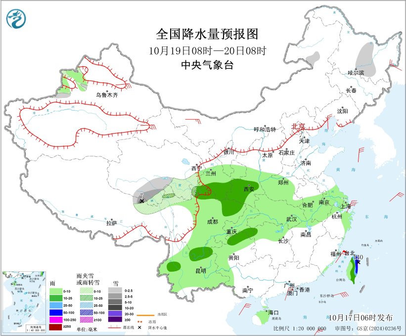 10月19日08时至20日08时,内蒙古东北部、黑龙江中南部、新疆沿天山地区西部、西藏东北部、青海南部等地部分地区有小到中雪或雨夹雪,其中,西藏东北部局地有大雪(5~7毫米)。川西高原东北部、甘肃南部、陕西中南部、四川盆地北部、重庆东南部、贵州北部、云南东北部和西南部、台湾岛大部等地部分地区有中到大雨,其中,台湾岛东部局地有暴雨或大暴雨(100~130毫米)。内蒙古西部、新疆北部和东部、甘肃河西等地部分地区有4~6级风;黄海大部、北部湾、巴士海峡、南海东北部偏南海域、南海西北部和中部海域将有5~7级、阵风8级的大风,东海西南部海域、台湾海峡、南海东北部偏北海域将有8~9级、阵风10级的大风(见图5)。