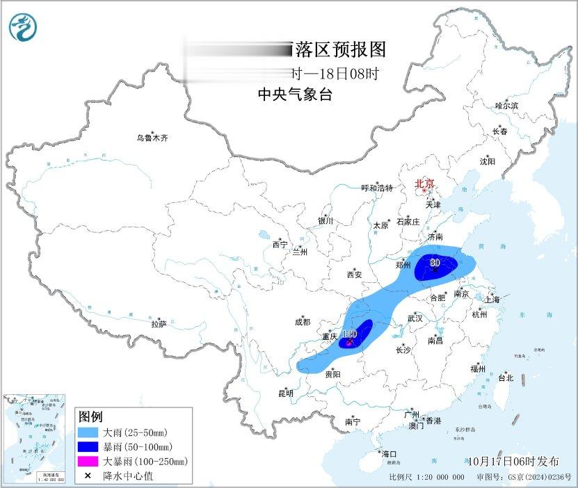 中央气象台10月17日06时继续发布暴雨蓝色预警:10月17日08时至18日08时,重庆东部和北部、湖北中西部、河南中东部、山东南部、安徽北部、江苏北部、湖南西北部、贵州西部和北部等地部分地区有大到暴雨,其中,重庆东南部、贵州东北部等地局地有大暴雨(100~120毫米)。上述部分地区伴有短时强降水(最大小时降雨量20~40毫米,局地可超过50毫米),局地有雷暴大风等强对流天气(见图1)。18日雨带南压减弱。