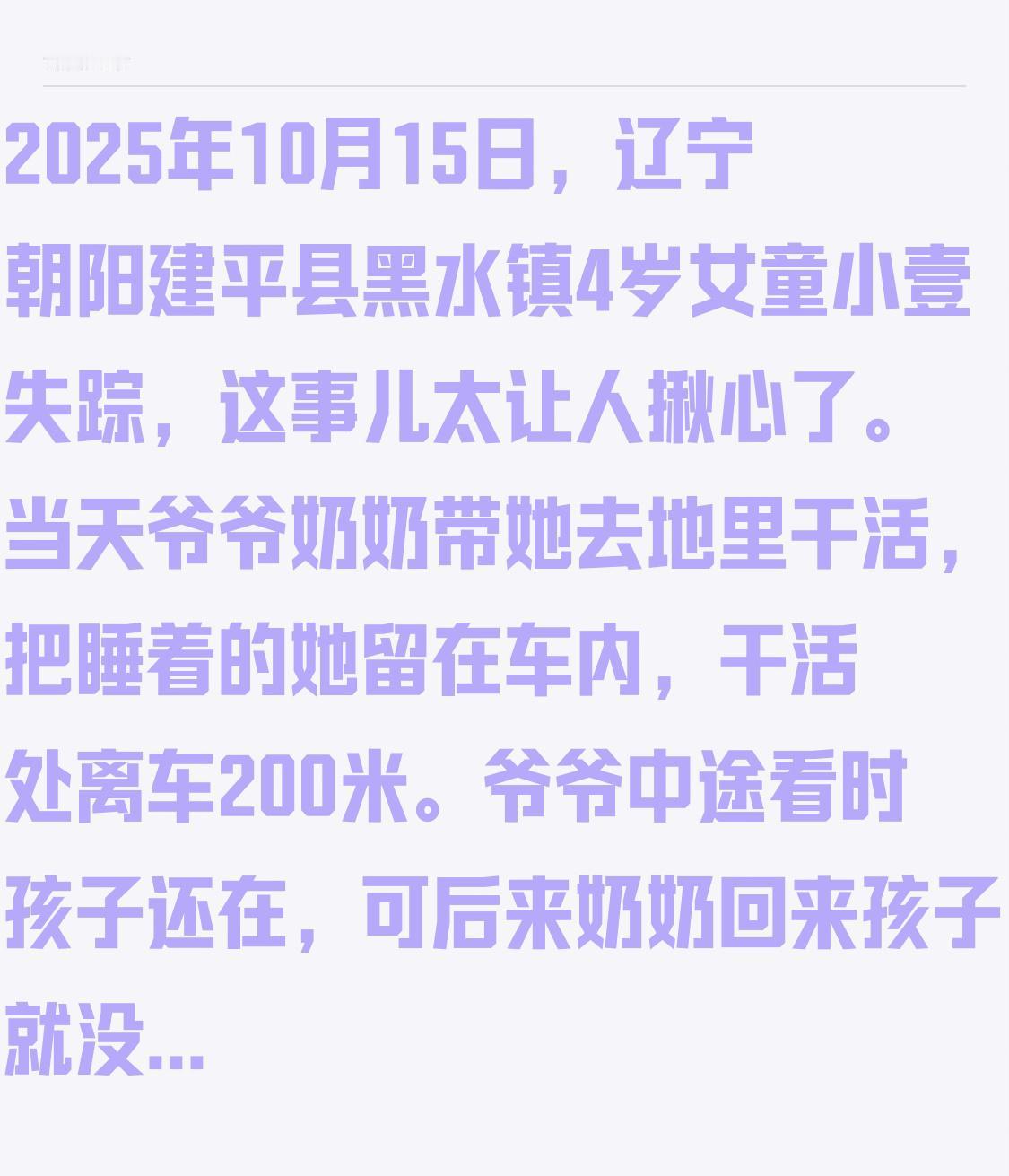 2025年10月15日,辽宁朝阳建平县黑水镇4岁女童小壹失踪,这事儿太让人揪心了。当天爷爷奶奶带她去地里干活,把睡着的她留在车内,干活处离车200米。爷爷中途看时孩子还在,可后来奶奶回来孩子就没了。车门没开,车窗却摇下一半。 目前孩子已失踪超24小时,当地出动近千人,用警犬、无人机等都没找到。警方也不确定是被抱走还是自己走丢。家属悬赏10万寻人,奶奶自责不已。小壹穿得单薄,当地夜间气温低至零下,真心希望她能平安归来。