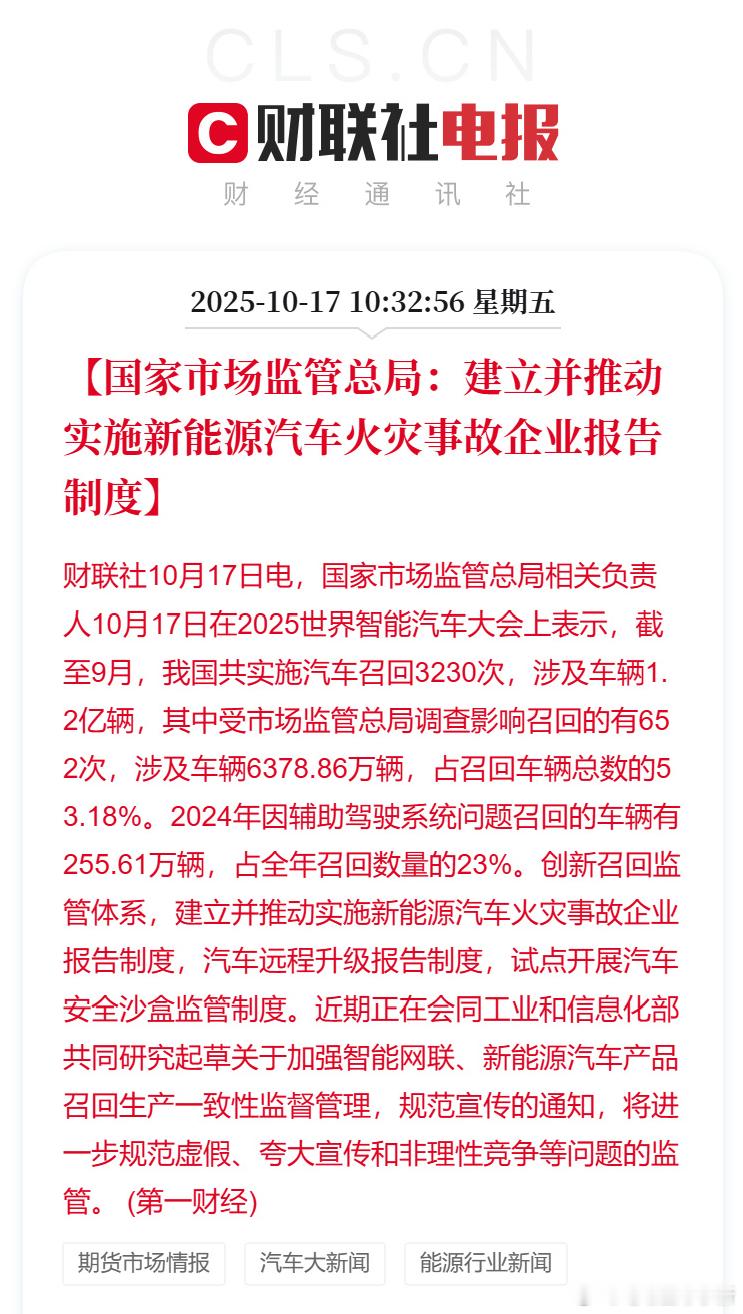 国家市场监管总局:建立并推动实施新能源汽车火灾事故企业报告制度,汽车远程升级报告制度,试点开展汽车安全沙盒监管制度。