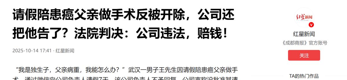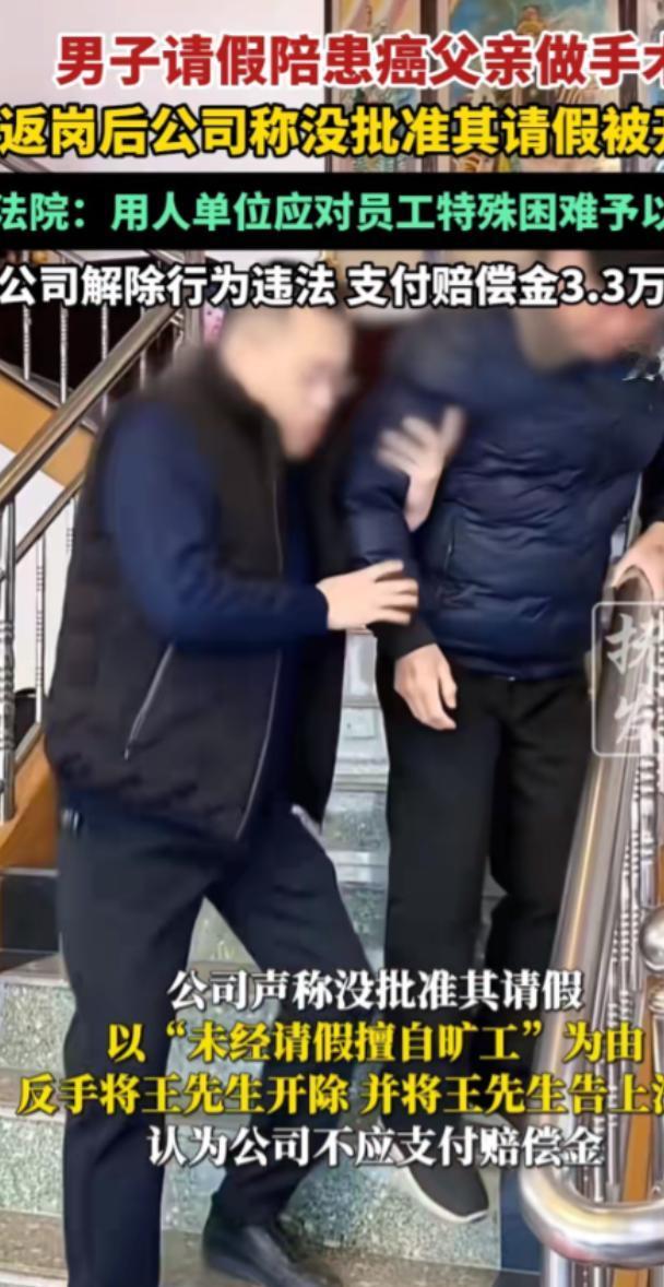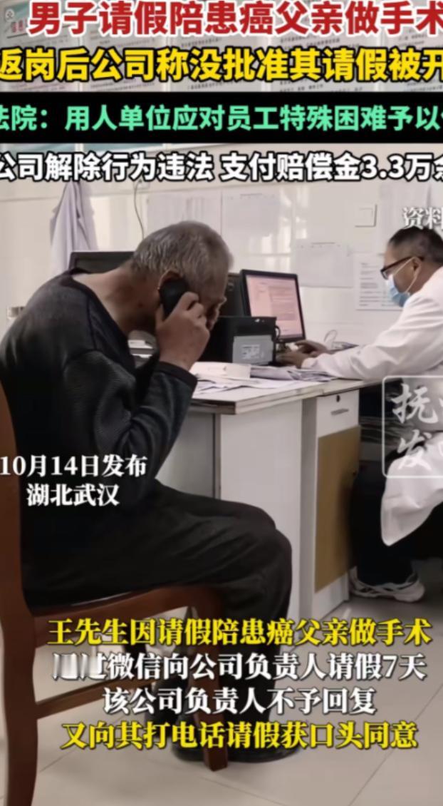 湖北武汉,男子要陪同患癌父亲手术,发信息跟总经理请假7天,总经理没回消息,男子又打电话请假。男子返岗后就被告知不用再负责采购工作,并被移出采购群,没过多久公司以旷工为由将男子辞退。男子申请劳动仲裁获赔偿,公司不服起诉拒绝支付赔偿,法院判决意料之中。 咱湖北武汉的王先生,前段时间遇上的事儿,听着就让人心里不是滋味,明明是为了陪患癌的父亲做手术才请假,结果假请完回来,不仅工作没了着落,还被公司按 “旷工” 给辞退了,最后折腾了快一年,闹到法院才总算讨回了公道。 王先生在一家建筑公司当采购专员,2021 年入职后,干活一直挺踏实,报表做得清清楚楚,物资对接也从没出过岔子,他是家里独子妈走得早,这些年一直跟父亲相依为命,父子俩的日子过得平淡却也安稳。 可谁能想到,2024 年初,一个晴天霹雳砸了下来,父亲去医院检查,查出了肝癌晚期,医生说必须尽快做手术,多耽误一天就多一分危险。 3 月 15 号晚上,王先生揣着满心的焦虑,给公司的李总经理发了条老长的微信,里面把父亲的病情说得明明白白,也讲了手术的紧急性,还申请了 7 个工作日的假。 他知道采购的活儿不能断,怕耽误公司项目,还特意把手里正在跟进的项目进度、对接的合作方联系方式,一条条列出来,做了份详细的工作交接计划,能想到的都替公司考虑到了。 可这条满是诚意的请假信息发出去后,却像石沉大海一样,李总经理压根没回,王先生一夜没睡好,心里七上八下的,既担心父亲的身体,又怕假没批成耽误事,第二天一早他实在没办法,硬着头皮给李总经理打了个电话。 后来这通电话的内容,成了双方各执一词的 “罗生门”,王先生记得清清楚楚,电话里李总经理不仅听他说完了情况,还让他安心陪父亲做手术,别操心工作上的事。可公司后来却改口说,李总经理当时就冷淡地回了句 “知道了”,甚至说根本不记得有这通电话。 但对当时心急如焚的王先生来说,那句 “知道了”,就是默认批准了假,他悬着的心总算放了点下来,赶紧安排父亲的手术事宜,转天就陪着父亲住进了医院。 连着周末算下来,王先生一共离开了 8 天,3 月 28 号父亲的手术很顺利,病情也稳定了下来,王先生没敢多耽搁,第一时间就赶回了公司。 可他刚到办公室,就被眼前的情况泼了盆冷水,他在公司的工作群里看到公告,自己负责的采购职责,已经被交给了别的同事。 更让他心寒的是,他发现自己被踢出了所有的项目群,之前对接的工作群也没了权限,这明摆着是不让他再插手采购的活儿了。 没等王先生弄明白怎么回事,4 月份的时候公司直接给他递了份解雇通知书,理由是他 3 月 16 号到 28 号期间 “擅自旷工”,严重违反了公司制度,还说不会支付任何经济补偿。 王先生当时就懵了,自己明明提前请假了,还做了工作交接,怎么就成了 “旷工”?他实在想不通,觉得公司这事做得太不合理,干脆申请了劳动仲裁想讨个说法。 仲裁的时候王先生把能拿出来的证据都交了, 和总经理的微信聊天记录、通话记录,还有当时写的工作交接计划,甚至连父亲的住院证明、手术单据都带来了,证据链摆得明明白白,仲裁结果也没什么悬念,公司属于违法解雇,得给王先生支付赔偿金,还要补上之前的工资差额。 可这家公司偏不服气,反手就把王先生告上了法庭,庭审的时候公司一口咬定从没批准过王先生的假,说没回微信就等于不同意,至于那通电话更是选择性失忆,说 “记不清了”。 更离谱的是他们还扯出个理由,说王先生的年假早就并入春节假期休完了,言外之意就是他没假可请,这些说法明眼人一看就知道是在找借口,想用制度当 “挡箭牌” 欺负人。 王先生也没绕弯子,直接跟法官说:“我又发微信又打电话,两种方式请假,该做的交接也做了,仁至义尽了,公司从没跟我说过请假得走别的流程,我‘旷工’那几天,也没一个人联系我提醒我,现在反过来怪我这不合理。” 法院最后也没偏向公司那套冷冰冰的 “规则”,法官说王先生为了给病危的父亲陪床做手术请假,事出有因,换成谁都会这么做合情合理,领导收到这么紧急的请假申请,要么明确拒绝,要么就该及时回复,不能用沉默或者模糊的答复应付,最后把后果推给员工,说白,就是看穿了公司是想利用规则漏洞,欺负处于困境中的员工。 2024 年 10 月,一审判决下来了,公司被判给王先生 3.3 万元的赔偿,还要补上拖欠的工资,公司还是不服接着上诉,结果今年 3 月的终审判决还是维持了原判。 (信息来源:红星新闻——请假陪患癌父亲做手术反被开除,公司还把他告了?法院判决:公司违法,赔钱!)
