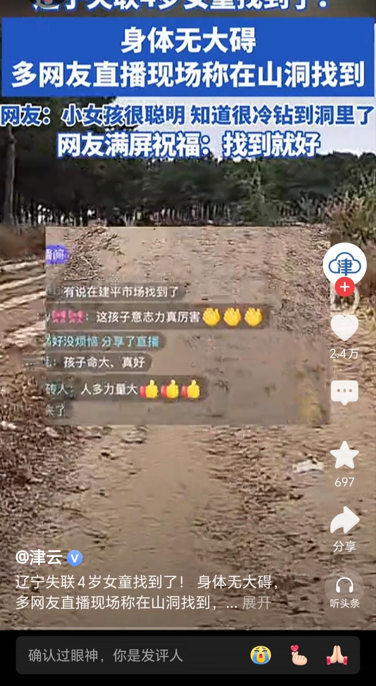 辽宁失联44小时小女孩找到了 经过长达44小时不间断的紧急搜救 辽宁朝阳建平县4岁女童终于被安全找到 10月17日上午孩子已被送往医院检目前生命体征平稳 他们再三表示,感激全国网友的关心与转发,更由衷感谢所有参与救援的公安、消防、医护人员、蓝天救援队以及每一位在田间山野中奔走搜寻的志愿者。 这名女童于10月15日下午在黑水镇大营子村的田地间走失,当时身穿红色外套。由于父母常年在外务工,她平日由爷爷奶奶照顾,此次意外牵动了全社会的心。 救援行动自接警后迅速展开,省、市、县三级联动,累计投入救援力量超过1.2万人次,多方协同在复杂地形中展开拉网式排查。10月17日上午,无人机在草丛中发现女孩的踪迹。救援人员迅速赶到,将她妥善包裹并转移。令人欣慰的是,女孩意识清醒,还能清晰与救援人员对话。 至此,这场牵动全国的搜寻行动以温暖结局告终。是无数人日夜不休的坚持,才换回了孩子的平安归来。