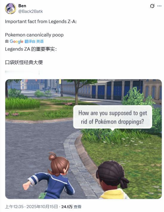 【宝可梦会拉屎】《宝可梦传说:Z-A》现已正式发售在Switch 2与Switch平台发售,据Back2Batk与teso_026等推主发布的消息报道,游戏里的皮卡丘实际上会排便,有NPC表示:“皮卡丘的便便比平时多,让我有点担心它。”除此之外,根据其他NPC的对话可以得知,本作里的其他宝可梦貌似也会排便:“你是怎么清理宝可梦的排泄物的?” 这一消息让不少玩家表示惊讶,一些玩家称自己第一次知道皮卡丘有这样的行为。