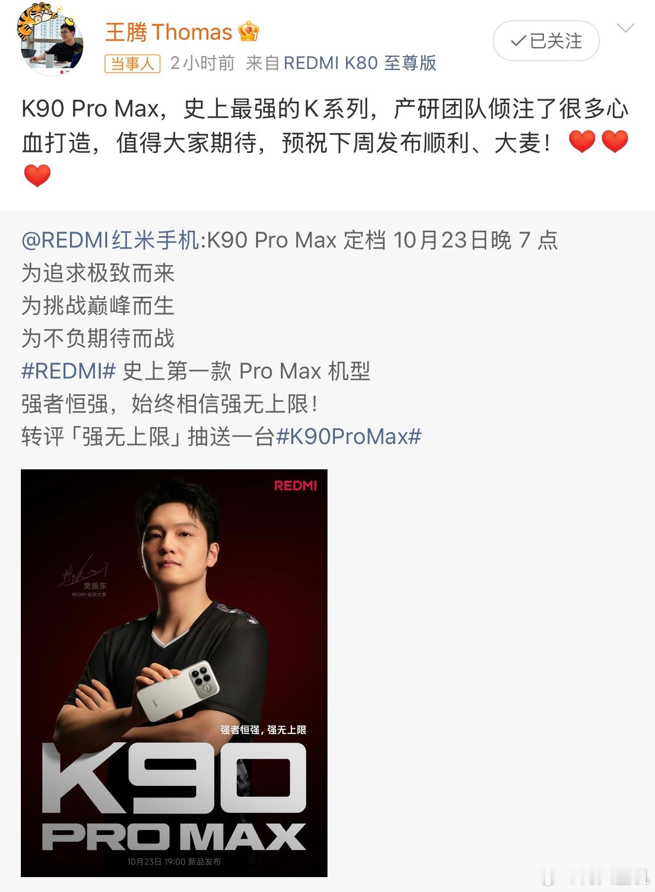 王腾宣传K90ProMax人走情还在,不管是出于什么原因离职,王腾和小米并没有闹掰,而且K90系列也是王腾主导参与的产品,作为王腾离开的最后一代产品,米粉们内心必然也是充满期待,希望这次不要因为改了名字涨太多。