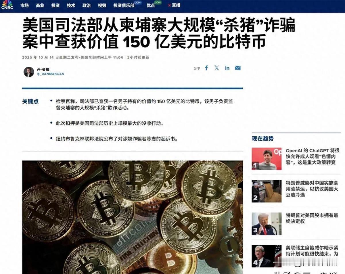 美国这次是端了柬埔寨“杀猪盘”的老巢啊?美国司法部这次直接出手,一下扣了12.7万枚比特币,价值150亿美元,创下史上最大规模查没纪录! 可比这数字更让人揪心的是,37岁主谋陈志掌控着10个诈骗园区,里面关着被当“现代奴隶”使唤的打工者,外面是被坑得家破人亡的全球受害者,这场跨国骗局,简直把“黑心”写满了每一个环节。 综合中国青年报等媒体报道,近日,美国执法部门重拳出击,破获这起柬埔寨大规模“杀猪盘”骗局,光是查扣的比特币价值就高达150亿美元,这一数字直接刷新美国司法部查没行动的历史纪录。 10月14日,纽约布鲁克林联邦法院公布起诉书,37岁的陈志被指控犯有电信欺诈和洗钱共谋罪,目前他仍在逃,据信藏匿在柬埔寨;一旦罪名成立,他将面临最高40年的监禁,为自己的恶行付出沉重代价。 另据纽约东区检察官办公室揭露,陈志掌控的王子集团不简单——这家公司在柬埔寨各地布下10个诈骗园区,早已“秘密成长为亚洲最大跨国犯罪组织之一”。 《今日美国》援引美国司法部助理部长约翰·艾森伯格的声明,更是揭开了诈骗园区的残酷真相:“被告是这个庞大电诈帝国的幕后策划者,整个帝国躲在王子集团的保护伞下,是个彻头彻尾建立在他人苦难上的犯罪企业。 被贩运的劳工关在监狱般的地方,被逼着搞大规模电诈,全球受害者数以千计,其中就有不少美国人。” 这些被囚禁的人,大多是被“高薪招聘”的广告骗来的普通人。一落地,护照就被没收,还被硬安上莫名其妙的“债务”;想逃跑? 迎接他们的是暴力威胁;不愿干活?连口饱饭都吃不上。他们成了犯罪集团的“工具人”,每天被逼着用微信等即时通信软件,跟素不相识的人“谈感情”“荐投资”,把别人的血汗钱骗进犯罪集团的腰包。 更值得警惕的是,这个犯罪网络早已不是“小打小闹”,而是形成了严密的分工体系:缅甸的团伙负责搭建虚假投资平台,还特意用新加坡的服务器隐藏踪迹;柬埔寨的窝点则借着金边、西哈努克港的赌场和地产项目洗钱,最后把钱悄悄转到迪拜的数字钱包里。 整套流程像“正规公司”一样高效,干的却是最肮脏的勾当。难怪美国检察官会说这是“像流行病一样肆虐的非法行业”! 对于,美国破获柬埔寨特大 “杀猪盘”,没收价值150亿美元比特币,大家怎么看呢?