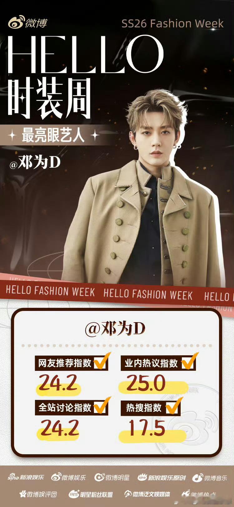 时装周最亮眼艺人TOP3迪丽热巴、邓为、鞠婧祎时装周最亮眼艺人前三!恭喜🎉🎉