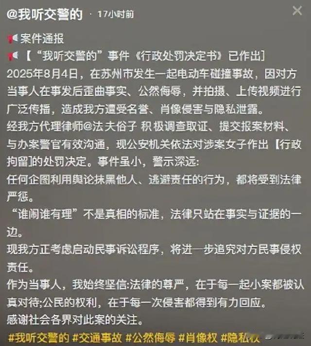 “我听交警的!”江苏苏州,小伙骑电动车正常行驶时,意外撞到了对面逆行的女子。女子为了让小伙承担责任,先是破口大骂,随后又装可怜博得同情,对此小伙就一句话:我听交警的。恼羞成怒下女子直接将没有打码的视频发到了网上,导致小伙遭遇网暴。最终小伙决定报警维权,最后的结局令人舒适。 齐鲁壹点十月十七号报道了这则小伙正常行驶时,和对面逆向行驶的电动车发生了碰撞,在对方胡搅蛮缠的情况下,小伙教科书式维权的新闻。 时间退回到八月四号早上,小伙骑着电动车等红灯时,刚准备起步对面忽然冲出来一个骑摩托车的女子,猝不及防下两人撞到了一起。 这本来是件小事,两人都伤的不重,正常情况大都是将车扶到一边,先看看情况,再来谈具体责任问题。 责任问题也是一目了然:小伙正常行驶,女子逆行直接撞了上来,肯定时全责。 这次女子的举动明显不一样,她直接拿出手机对着小伙录起了视频,开始就是质问:“你怎么骑的车,看到我过来不会让一下吗?” 小伙的反应更是令人意外,一般碰到这种不讲理的人,很容易就吵起来了,可小伙只是不慌不忙的拿起水喝了一口道:“这事我听民警的,一切听他们的安排,怎么处理我都接受。” 小伙的反应明显超出了女子的反应,愣了一下后道:“怎么撞了人不承认吗?这事和你没关系吗?” 这种情况小伙只要接茬,女子就能直接甩锅,这样等民警来了就没责任了。 小伙表现的依旧十分淡定,不搭话也不解释,翻来覆去只有一句话:“我听交警的!” 不光女子傻眼了,旁边围观的人也懵了,只见全责的那方拿着手机录视频,一副理直气壮的样子;无责的那方淡定的喝着水,仿佛这事和他无关。 见对方油盐不进,女子的脾气再也控制不住了,退口而出道:“撞了人还这么若无其事,真不知道你这种人怎么活到现在的...” 小伙依旧云淡风轻,回了句:“我活的好好的,怎么生活和你没关系,撞人这事等民警过来处理就好了!” 女子见硬的不行,就开始来软的,说自己的生活怎么这么艰苦,可小伙依旧没有反应,连话都懒得说。 到了这个时候女子终于破防了,各种污言秽语骂了出来。 小伙则凭借强大的自制力和心理素质,全程没有一句对骂和解释,终于等到民警赶到。 民警在提前查看监控和询问围观群众,很快认定这起事故是女子逆行导致的,需承担全责,很快这起事故就定了责。 这下女子不乐意了,和执法民警吵了起来,最后更是表示要起诉。 对此民警表示可以到队里协商解决,随后就准备带两人回去处理。 途中也许是心虚了,女子在一个拐弯的时候遛了,等民警和小伙反应过来,人已经走远了。 想着撞得也不厉害,这本来就是件小事,小伙就准备息事宁人了,可女子接下来作死的行为,让小伙决定维权到底。 原来女子跑了之后,可能是为了出口气,就将没有打码的视频发到了网上,她还将自己包装成受害的一方,目的是引导人网暴小伙。 果然视频传到网上后很快引起了热议,但后续的反应超出了女子的预料:更多人在看完视频后选择支持小伙。 可就算这样,因为没有打码,小伙的生活还是受到了很大影响,也招来了一些谩骂。 看到自己的隐私被这样泄露,小伙选择在八月十四号这天报警维权。 接到报警后,民警很快就出具了立案通知书,正式开始调查此事。 那么,从法律角度,如何评价女子的行为?她将受到怎样的处罚? 根据《治安管理处罚法》第42条规定:有威胁他人人身安全;公然侮辱或诽谤他人;诬告陷害他人;打击报复证人及其近亲属;发送骚扰信息干扰他人生活;偷窥、偷拍等侵犯隐私行为,将被处5日以下拘留或500元以下罚款;情节较重的处5日以上10日以下拘留,可并处500元以下罚款。 该事件中在女子全责的前提下,多次辱骂小伙,且在没有打码的情况下将视频发到网上,引导他人网暴,其行为涉及公然侮辱或诽谤他人,依法需承担相应的法律责任。 此外,根据《民法典》第995条规定:人格权受到侵害的,受害人有权依照本法和其他法律的规定请求行为人承担停止侵害、排除妨碍、消除危险、消除影响、恢复名誉、赔礼道歉等民事责任;受害人的人格权请求权不适用诉讼时效的规定。 女子发布视频不仅没有打码,还公然歪曲事实,严重侵犯了小伙的肖像权、隐私权和名誉权,小伙依法有权要求女子停止侵害并在网上公开道歉,同时赔偿损失。 十月十五号小伙公布了对女子的《行政处罚决定书》,作出了行政拘留的处罚决定,同时小伙也在准备申请民事诉讼,追究其民事责任的同时索取相应的赔偿。 那么,对于女子的行为,你是怎么看的呢?