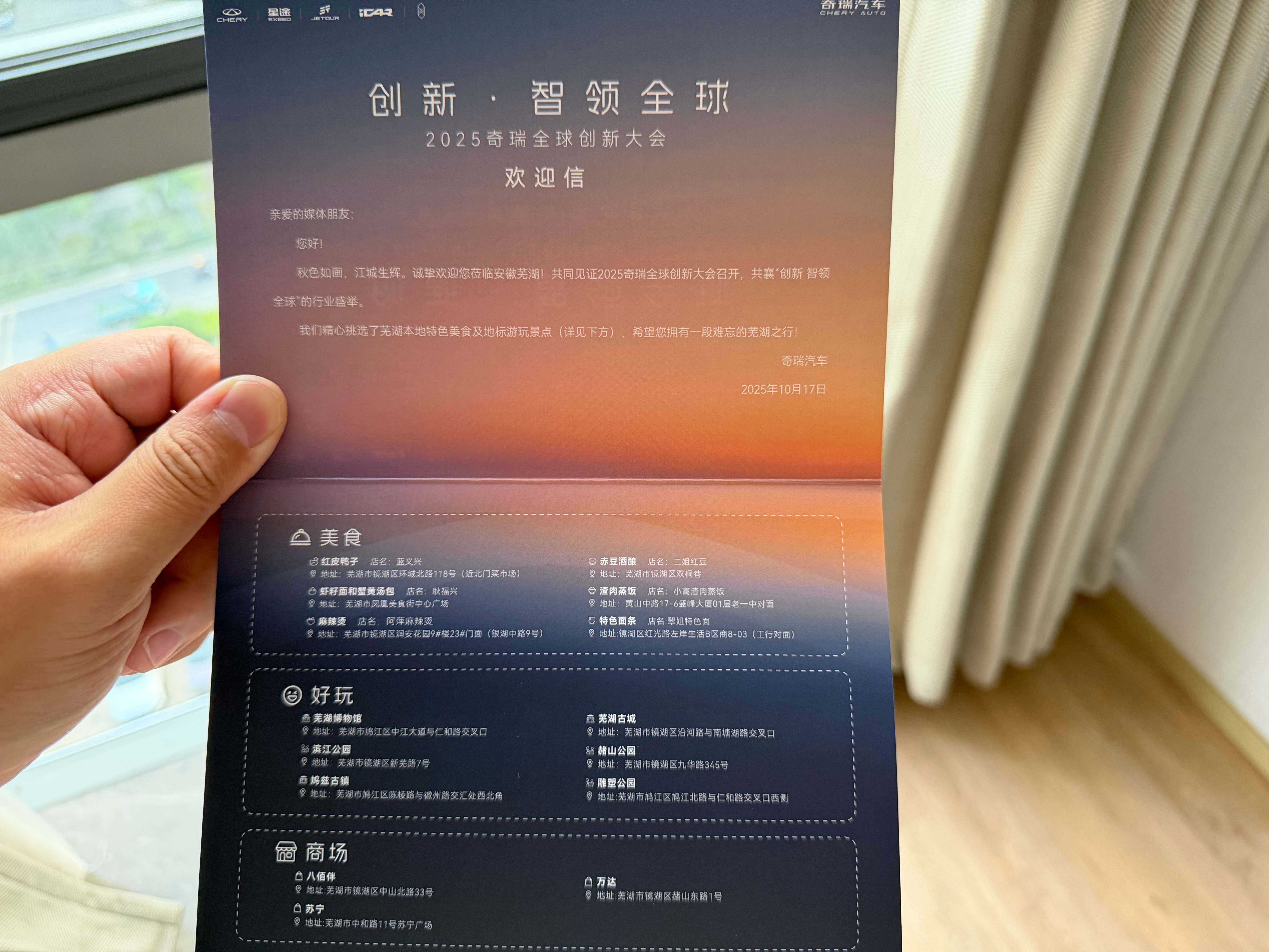 来芜湖参加2025奇瑞全球创新大会奇瑞服务真贴心,媒体要在芜湖呆四天,在给的欢迎