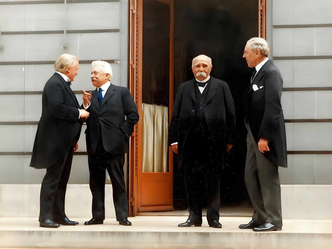 这张照片定格了1919年巴黎和会“四巨头”的历史性会面,从右至左依次是伍德罗·威尔逊(美国)、乔治·克里孟梭(法国)、戴维·劳合·乔治(英国)、维托里奥·埃曼努尔·奥兰多(意大利)。 1919年1月至6月,四巨头在凡尔赛宫的密室中进行了数十轮谈判,最终签订的《凡尔赛和约》成为他们利益妥协的产物。四巨头的谈判本质是一场“分赃会议”:他们以“缔造和平”为名,实则为各自国家争夺利益。《凡尔赛和约》的不公与短视,未能真正解决帝国主义国家间的矛盾,反而激化了德国的复仇情绪,也为意大利法西斯势力的崛起提供了土壤。正如克里孟梭的预言:“这份条约会给我们带来负担、麻烦、痛苦、困难,而且会持续很长一段时间。”