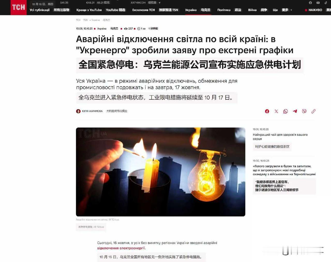 乌克兰停电了,这次还是全国范围内的。消息说,基辅街头到处都是柴油发电机的声音,充满了嘈杂。有人说,这是伊斯坎德尔导弹造成的,一次26枚,乌克兰的防空系统,根本没用。我记得泽连斯基曾说,要把俄罗斯打成是能源进口国,结果自己先停电了。不仅停电,据说一些地方还停水。最关键的是冬天即将来临,乌克兰缺少能源,可怎么过冬?指望欧洲小伙伴,似乎也靠不住,毕竟到了冬天,欧洲也缺天然气啊!建议泽连斯基安稳点,别再挑衅了,否则今天冬天就是乌克兰的终结日!