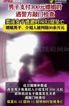 今年7月,陕西一男子找“小姐”,结束后“小姐”给她介绍“女同事”,男子就让她将女同事叫过来。结果还没开始交易,就听到了敲门声,“女同事”准备从12楼翻出去逃跑,结果摔死,法院判死亡赔偿金、丧葬费、精神损害抚慰金加一起,男子和这个女子得共同赔偿335654.34元。 网友评论: 有敲门的不得问一下是谁,或者就不知声。敲几下以为没有人不就走了。从那么高的楼窗户走就是找死。 这么高的楼,跳楼者不考虑床单的安全质量,绑的是否结实等一系列安全因素,自己不查看查看吗,他自己是成年人,应该承担主要责任。 打麻将赌博的也有不少人因为突然的敲门声而选择逃跑,跳楼的。摔伤的不在少数。 哪有我老婆牛逼,她把前男友带进家来,跟我说是初中同学,来找工作的,我还傻傻的,招待一番。 这就是没钱的悲哀,有钱的可以包养一个生的娃还有继承权。