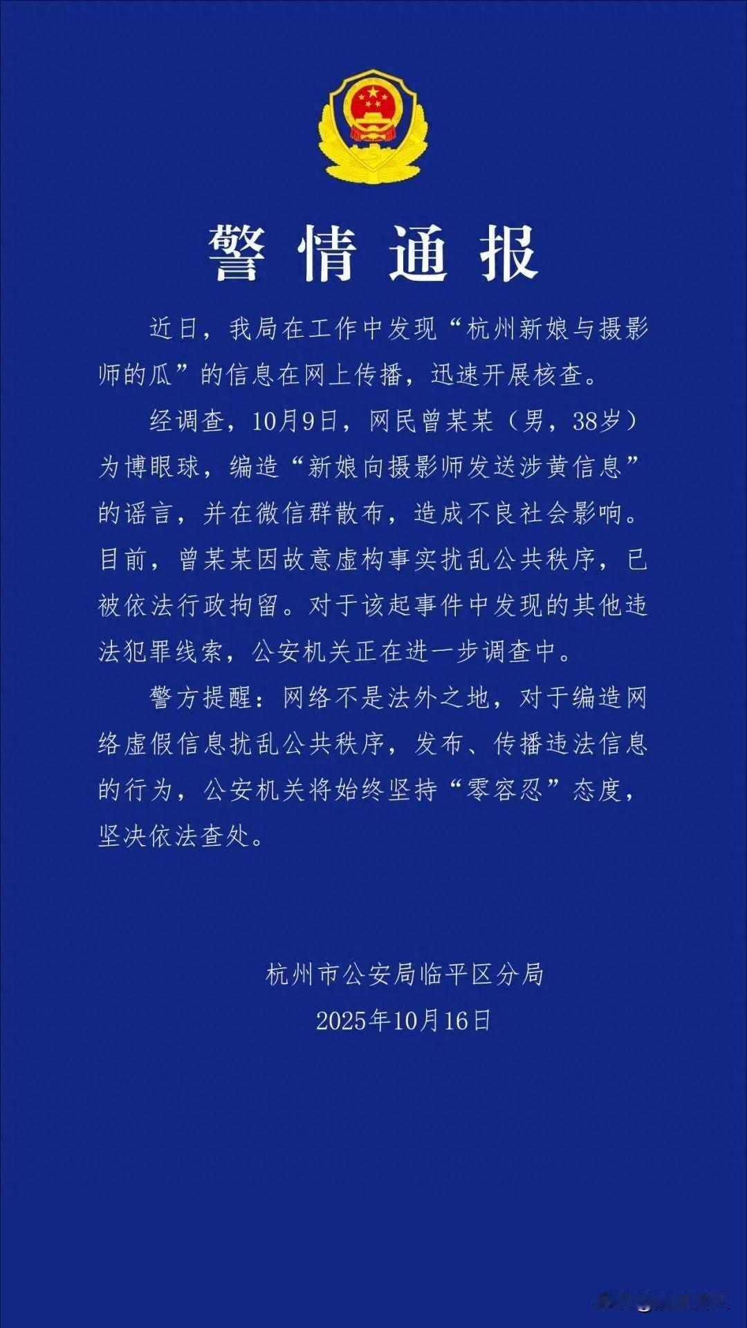 新娘误发私照?摄影师躺枪?谁在背后推波助澜? 2025年10月9日,有个叫曾某某的男人在微信群里说,杭州临平有个新娘,不小心把不雅照片发给了摄影师,这话一传开,不少人就信了,到10月14日,当地部门出来说明,说这事是假的,10月16日,警察把他抓了,说他造谣扰乱了公共秩序。 这事儿能火,不是碰巧,他挑的词太扎人,新娘、摄影师、涉黄,哪个不是人一碰就炸的,消息从微信群冒出来,转眼就爬到微博、抖音、小红书,有人琢磨,背后是不是有人操盘,想靠转发捞粉赚钱,可到现在,也没人能拿出真凭实据。 这事也暴露了不少问题,婚庆行业这几年老出事,偷拍、删片,大家对摄影师本来就不太信,谣言一出来,很多人就信了,新娘被说成发错图,其实是把女人往道德低处拉,这种套路2024年就用过,女教师被造谣,也是这么干的,平台反应又慢,公安都辟谣了,算法还在推那些带争议的词。 这件事碰巧赶上了时候,2025年秋天,好几部讲婚礼和恋爱的剧正播着,大家心里都盯着婚姻这事,谣言选在这时候冒出来,正好戳中了人心里的那根弦,官方反应挺快,可更该想想的是,为啥一条假话能引来这么多人看热闹,我们是不是光顾着瞧热闹,懒得去琢磨真假了,真相反倒没人愿意细看了。摆拍谣言