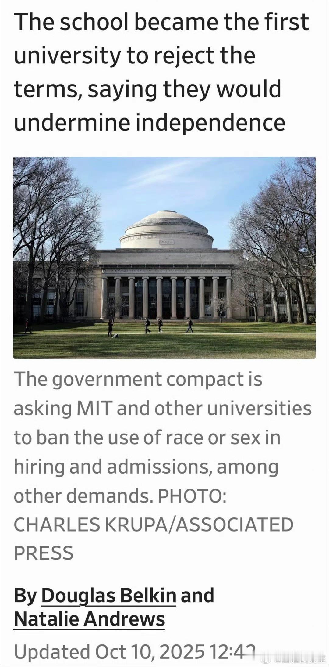 MIT(麻省理工学院)拒绝与白宫签“合约”,成为美国第一所为了保证学术自由、宁愿