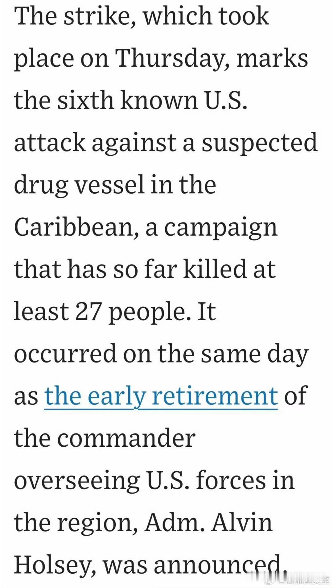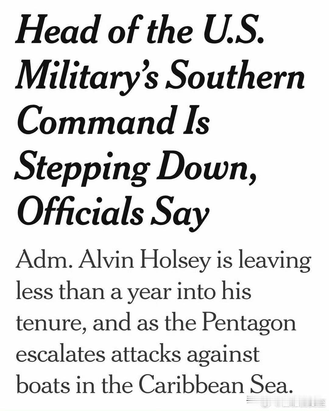 美军南方司令部司令辞职,距上任不到一年。 没有公开原因,国防部长对他的服务表示了感谢, 南方司令部职责包括加勒比地区,美媒普遍认为,他是不同意近期的海上“缉毒”行动而辞职。 所谓的“缉毒”行动,实际就是要推翻委内瑞拉现任总统查韦斯。 联想到2025年诺贝尔和平奖获得者马查多,她就是委内瑞拉反对派政治领袖。日前曾提出,将委内瑞拉国有企业私有化,之后交由美国经营。 看来美国已经用了两手,武力干预和颜色革命。 以“缉毒”名义,动用军事力量去颠覆一个主权国家的合法政府,这事也能做得出来。 对于“缉毒”行动两党有分歧,参议院试图阻止海上进攻的投票失败,即将进行“陆上进攻需国会授权”的投票。 但参议院即使通过,阻止行动的可能性也不大。因为总统的权力越来越不受约束。