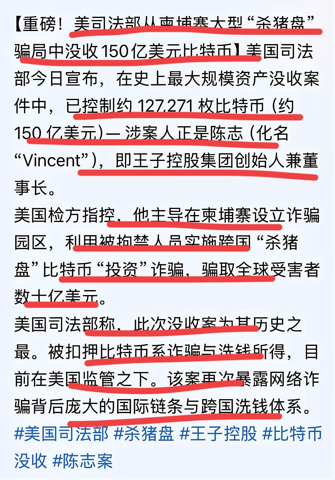 柬埔寨电诈首富陈志,这回彻底栽了!! 通过控制150个园区,杀猪盘获得千亿比特币资产被美帝没收!! 这位从福建跑到柬埔寨创业的38岁其貌不扬的男人,已经身家千亿,但万万没想到的是,他通过杀猪盘坑害国人,诈骗来的巨额财富,最后竟然被美帝不费吹灰之力一把全部收割了! 这回不但陈志要哭洪老大估计也哭晕在厕所了吧~ 还是那句话,多行不义必自毙,只是我们下手有点晚了,又让美帝占了先机~ 不得不说,还是美帝够狠,够直接!! 我再想,比特币不是去中心化,不受控制的么?怎么美帝可以做到想没收就没收呐? 对此,你有何看法呢?