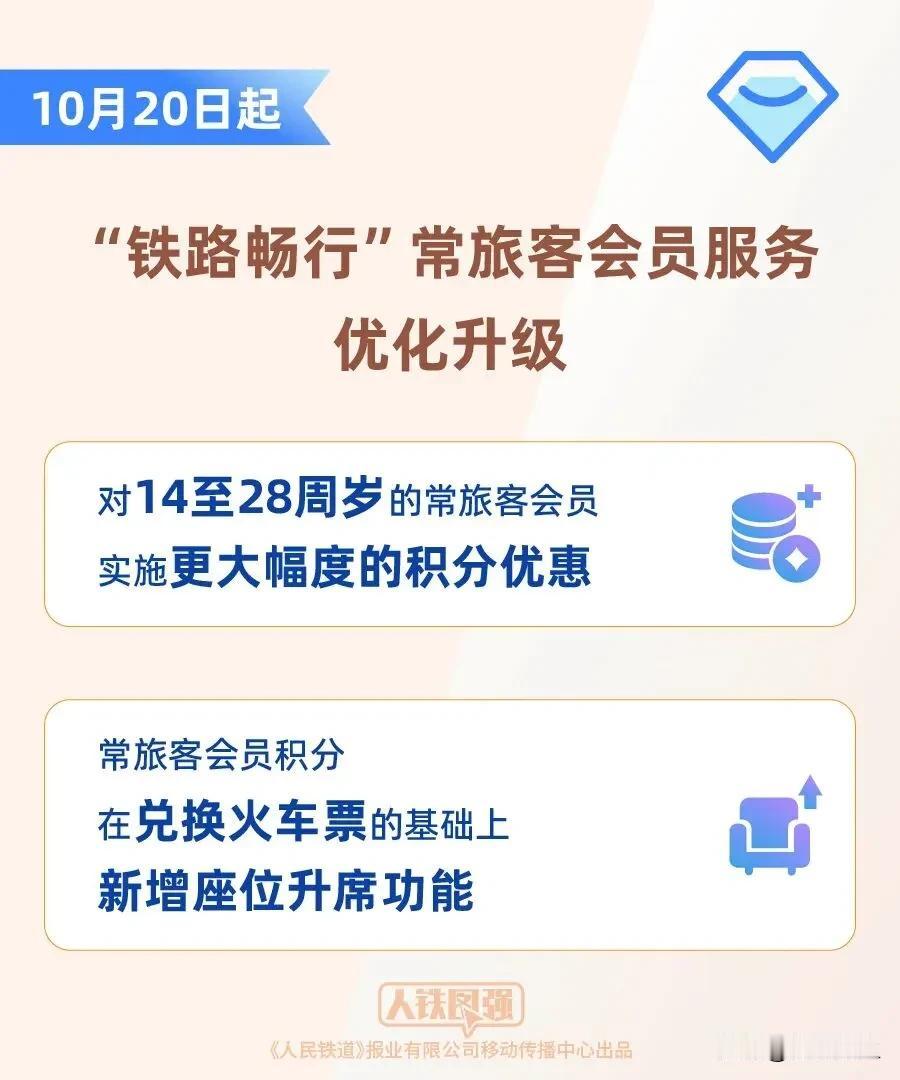 国铁新规:10月20日起火车票可用积分兑换升席 铁路积分终于值钱了! 国铁集团宣布:10月20日起,旅客可使用铁路畅行积分兑换列车座位升席服务。积分兑换比例为100积分=1元,兑换后原车票失效。目前铁路积分仅可兑换车票,新规将提升积分使用灵活性。网友实测:北京-上海高铁二等座升一等座需补差价200元,约消耗20000积分(需乘车40000公里积累)。但有用户吐槽:"积分有效期仅12个月,常年出差党才用得上"。你觉得这是便民新政还是营销噱头?
