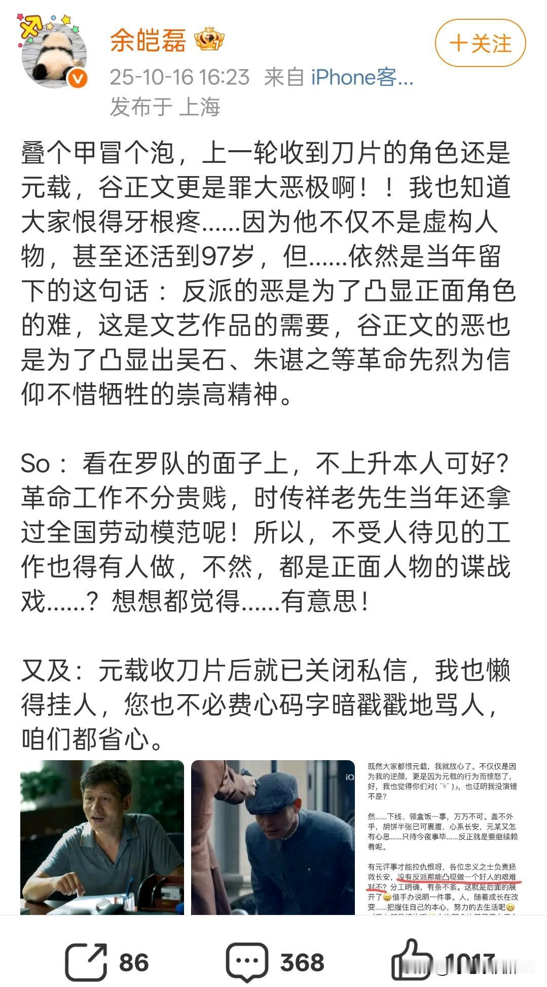 《沉默的荣耀》谷正文让人恨得牙痒痒,余皑磊在线求放过[呲牙] 谷正文这个角色不是虚构的,什么历史上存在的人物,而且还活到了97岁,但是经他手迫害的忠良聂曦才32岁,朱枫才45岁,吴石将军56岁 谷正文虽然坏,但是这说明演员演得好啊!反派是能凸显正派的不易呀!为什么还有网友骂演员老师 而且余皑磊演的《庆余年》邓子越很正派呀!演技也好:“世间多不公,以血引雷霆,蠢就蠢了嘛,大人!”还记得吗?角色上升到演员算什么本事,直接去找谷正文本人呀!