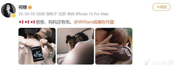 陈伟霆何穗官宣生子!18日,官宣得子:“📢📢📢爸爸、妈妈还有他。”并晒出B超照、孕肚照以及孩子背影。