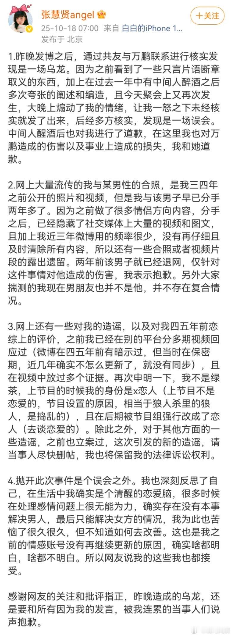 早上张慧贤发文向万鹏道歉,称联系核实之后发现是一场乌龙,对万鹏造成的伤害以及事业上造成的损失表示道歉。