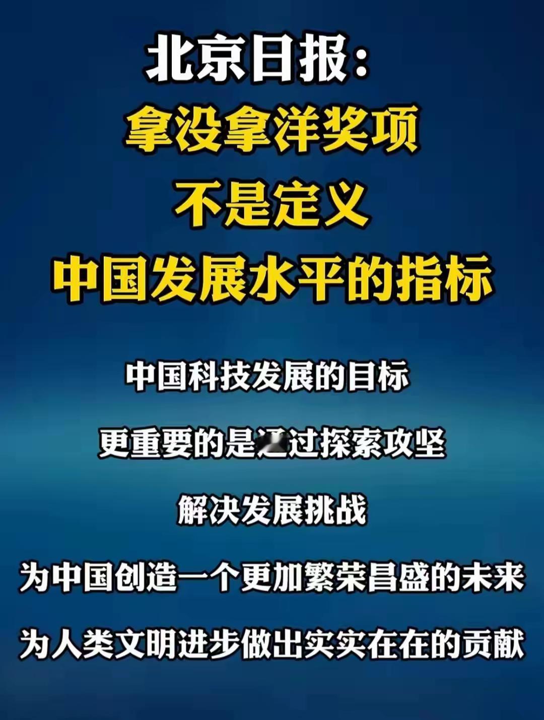这个评论颇有“小孩没得奖耍无赖”的感觉!定义中国发展水平的指标当然不是“洋奖项”,而是GDP。中国科技发展的目标当然也不是取得“洋奖项”,而是解决发展问题。北京日报用这种“张冠李戴”的评论来否定“洋奖项”,颇有没得奖的小孩子耍无赖的感觉。 “洋奖项”重不重要? “洋奖项”太多了,诺贝尔奖、菲尔兹奖、计图灵奖、雨果奖、奥斯卡奖、格莱美奖……就连奥运会的奖牌都是洋奖。 每一个洋奖,都代表着某人在某领域的顶级成就,虽然未必每次的评奖都丝毫不差,但是整体也大差不差。刚去世的杨振宁就是诺贝尔物理学奖的获得者。 所以,某个国家在某些领域获得的国际奖项,大概是这个国家在某个领域的天花板水平的体现,或者基础水平的体现。 所以,可以说重要,毕竟是一个国家在国际上的“面子”。也可以说不重要,因为有些顶级奖项一点意义也没有,以及国外创新的科学理论有大部分是被中国人落地应用,从而推动社会发展。