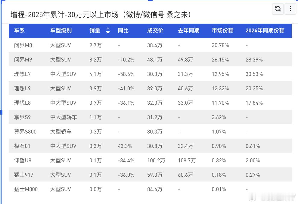 2025年1-9月,30万元以上增程市场共计销售31.4万辆,同比下滑2.5%,平均成交均价38.4万元,与去年同期比较下降2.2万元,折扣率7%,折扣下滑1个点,在各燃料类型中市场份额增加1.7个点,为18.7%。