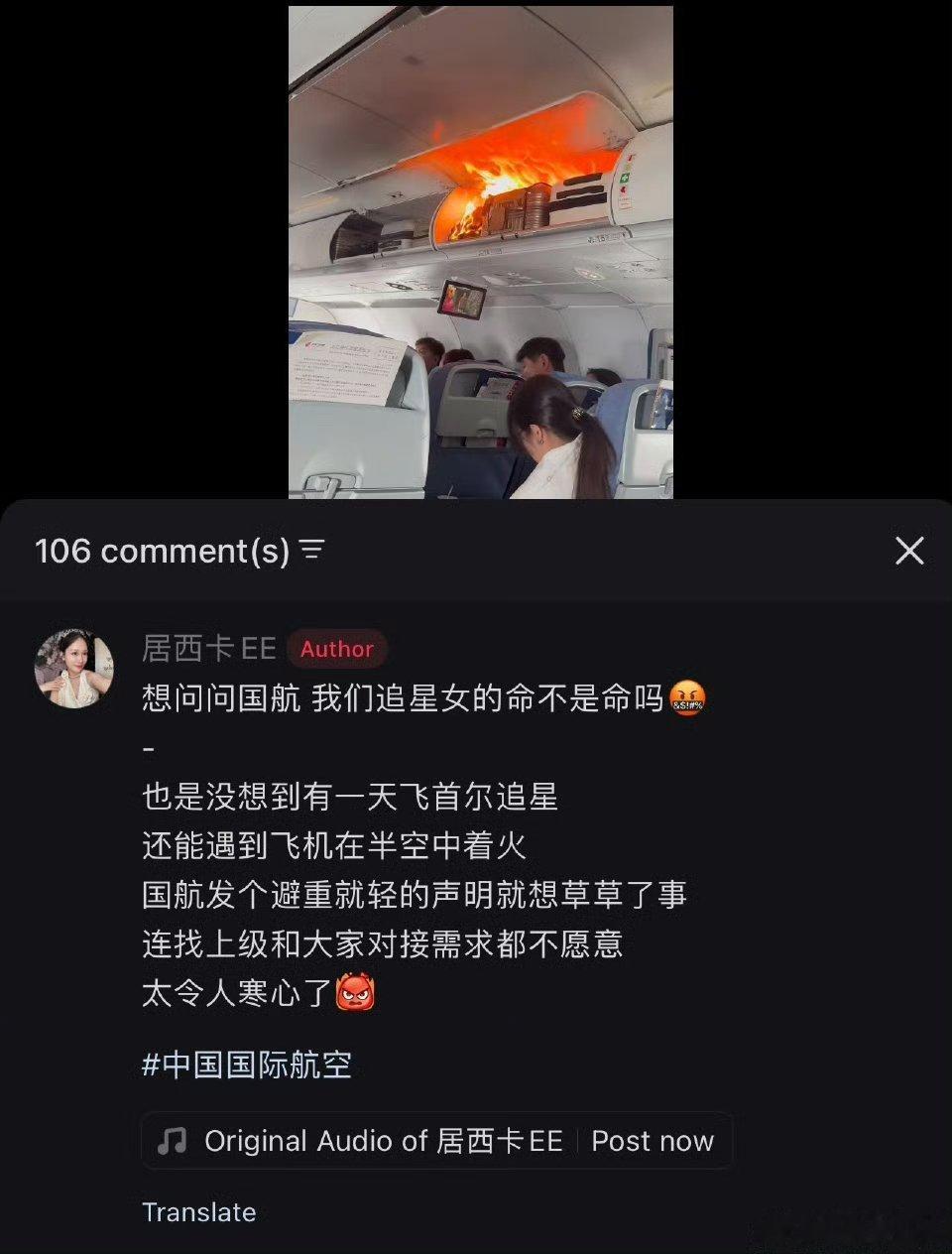 国航由杭州飞仁川的CA139航班因行李架中的锂电池起火,备降浦东机场。无人受伤。