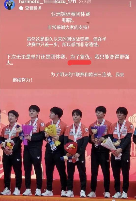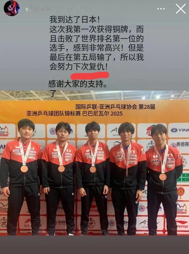 张本智和把队友们带跑偏了,他们的想法如出一辙 亚锦赛已经结束,日本男队获得了铜牌,女队获得了银牌,现如今日本队已经回国。 日本队回国后纷纷接受了媒体采访,他们如出一辙的都有同一个想法,这种想法真的很可怕。 事后张本智和他在媒体上发文: 认为这次亚锦赛的失利非常遗憾,冠军就在眼前没有拿到,自己很失望。他表示在接下来的比赛中自己会变得更强,他要复仇中国队。 日本另一队员松岛辉空表示,这次亚锦赛他第一次获得铜牌,而且击败了排名世界第一的选手,感到非常高兴,但他在第五局输了,他会努力下次复仇的,不出意外他也提出了复仇中国队的计划。 这位初来乍到的18岁的小将走了大运,亚锦赛第二盘直接把世界第一王楚钦给赢了,日本像看到了外星人一样对他崇拜不已。 现在日本队员满脑子复仇计划,把体育运动当作深仇大恨,已经违背了体育运动的精神,体育运动的精神是让大家放下仇恨,增加了解,友谊第一。现在日本已经背离了。 张本智和不但自己有复仇的想法,他还把队友也感染上了,复仇已经深深的印在他们到心里,有这种想法很危险,体育运动是竞技运动,凭本事争胜负,没这个实力就不要玩,满世界的复仇不可取。 张本智和和他的队友是全世界独一无二,真没听到国际上其他队员整天口口声声的要复仇,即使输了也是从自身找原因,努力改进提高技能水平。现在张本智和的复仇思想已经在日本体育队伍中蔓延,真不是好事情。 日本体育部门不管吗?队员有这种思想很可怕!张本智和表情包 张本智和父亲 张本智 张本智和恋情 世乒联冠日本站 日本乒乓球梯队 张本智和同人文