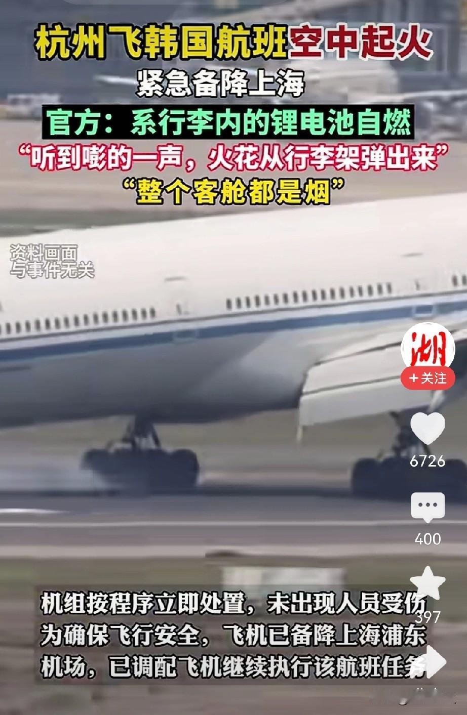 查了一下韩国飞杭州航班着火紧急备降上海的事, 真是不查不知道,一查吓一跳, 没想到,今天中午杭州飞韩国的国航CA139航班上,旅客行李架突然冒烟起火,是行李里的锂电池自燃了。 机组反应挺快,按程序马上处理,最后没人受伤,飞机紧急备降上海浦东,国航还调了飞机继续送大家飞。 坐这趟航班的乘客说当时客舱都是烟,行李架都熏黑了,听着挺吓人,好在机组专业,没出大事。 现在坐飞机最怕遇上突发情况,可这次处理得这么及时稳妥,是不是该给机组点个赞?