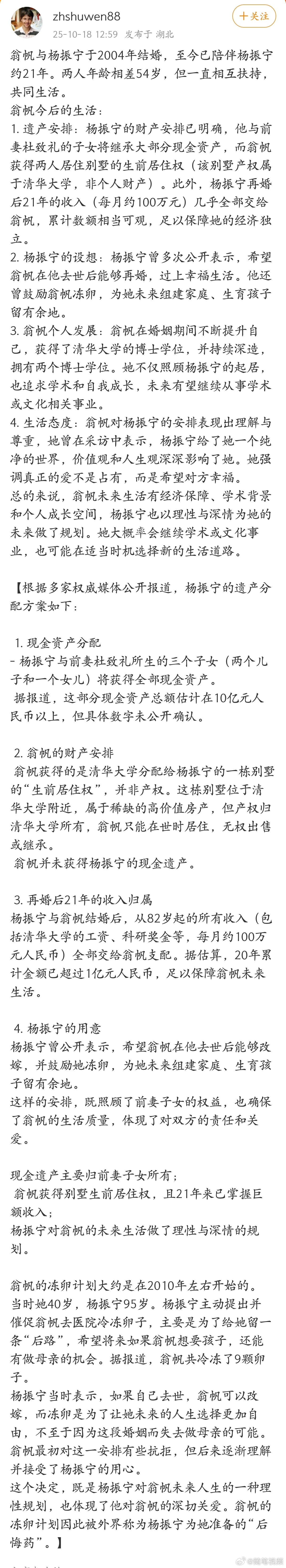 关于翁帆今后生活的讨论,杨老待翁帆是真的不错。杨振宁20年前预言已基本实现