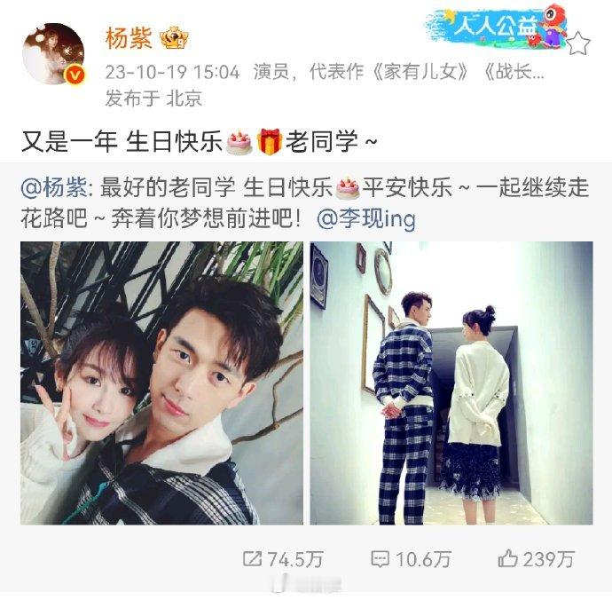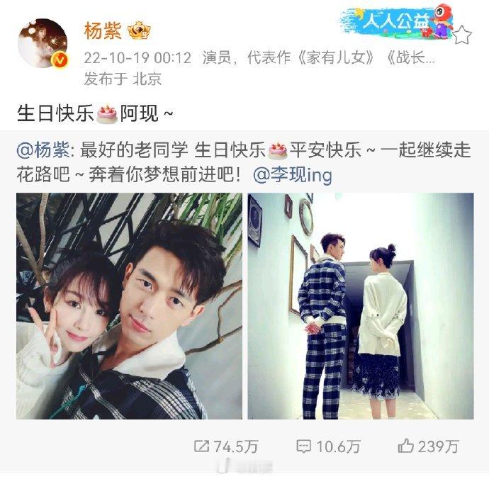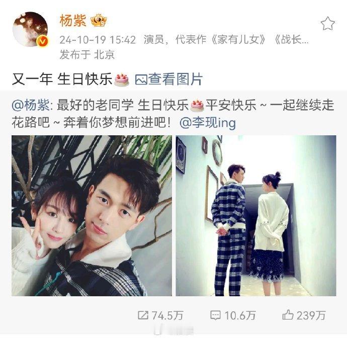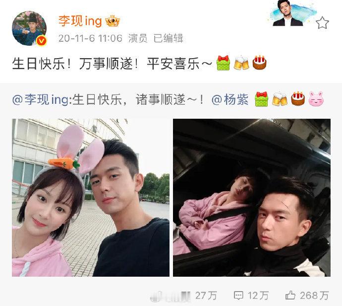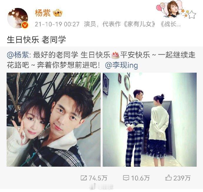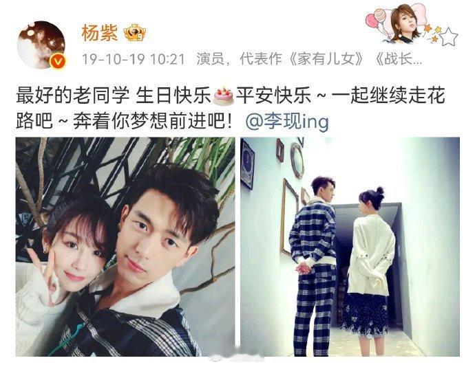 杨紫连续七年为李现庆生杨紫:今年依旧~老同学生日快乐[蛋糕]祝李现生日快乐