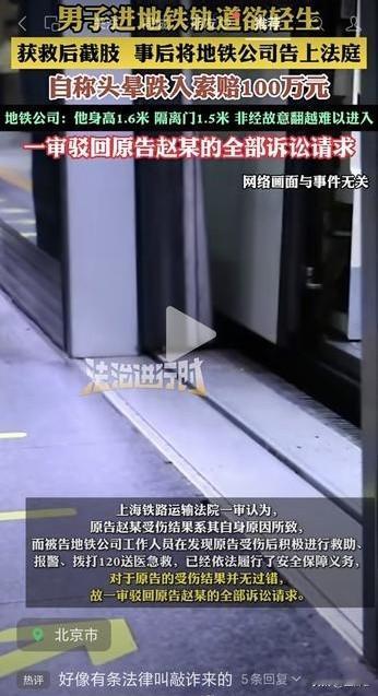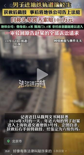 农夫与蛇上海版:地铁20分钟生死救援,换回百万天价索赔单!法院判了亮了! 近日,上海铁路运输法院公布了一起向地铁公司索赔百万的案件,一审判决,驳回原告所有诉求,地铁公司无责! 事情发生在2024年3月,某晚,地铁3号线刚驶离站台,期间列车员、接站员均未发现异常。 突然有乘客向地铁工作人员反映,有人在列车尾部的轨道区内。 车站工作人员立马组织营救,激活紧急关闭按钮并报告车控室和值班站长,将伤者赵某从轨行区抬至站台管理用房。整个过程不到20分钟,伤者就被抬上了救护车。 随后工作人员又将其断肢送到医院,但医生诊断后确认无法接上断肢,赵某右手前臂截肢,后被鉴定为六级伤残。 执法警察多次问询赵某当时情况,赵某一再表示自己不想活了,自己承认,是自行翻越站台屏蔽门后进入轨行区卧轨自杀的。 而此时,赵某的女儿女婿因为赵某失联,曾拨打110报警,并前往上海寻找。其女婿曾说,赵某有焦虑症,因为工作不顺有轻生念头。 没想到,后期赵某却以自己头晕滑倒后跌落轨道区内,地铁工作人员没有及时发现并救治自己,导致自己六级伤残为由,将地铁公司告上法庭,索赔百万。 地铁公司提供证据,赵某身高一米六,而要从1.5米高度的屏蔽门(墙)直接滑倒跌入轨行区显然不可能。 而警方提供的当初接警后的口供明明白白,赵某明确说自己不想活了,不应该救自己,自己就是要卧轨自杀。 白纸黑字红色手印,一点假也掺不得。 地铁工作人员在发现赵某的意外后,一系列营救措施,及时、准确,没有任何延误或者不作为的行为。 最终,法庭驳回了赵某的所有诉求,判处地铁公司无责! 网友们纷纷谴责赵某的这种忘恩负义行为: “妥妥的敲诈行为!” “地铁公司应该告他,耽误车辆运行,危害公共安全!” “判的好!不能让无赖得逞!” “浪费社会资源。” “人性的恶体现的淋漓尽致!” “故意讹诈应该追加刑事责任!” “哪家律师接的赵某的案子?公布下,让国人避避坑!” “反诉他敲诈勒索!” 赵某被截肢,是自己的一意孤行造成的结果,地铁公司救了他,却被告上法庭。 这不是新版的农夫与蛇又是什么? 有人说,应该尊重他人命运,由他去! 如果没有发现,导致了悲剧的发生,只能叹一声好走。 但发现了,如果不营救,道义上说不过去,道德上迈不过去,情理上绕不过去,责任上放不过去。 万万没想到的是,救人居然救下来一个大麻烦,被救之人非但没有感恩,反而是反咬一口,要求百万的天价赔偿。 幸亏,法庭公正判决,安了国民的心。不然,真遇到意外了,谁还敢出手相救?谁还敢见义勇为? 法律是善行的“护身符”,而不是恶行的“敲门砖”。 一个健康的社会,既要有救助弱者的温情,也要有惩处“反咬一口”之人的勇气和智慧。 法律的刚性判决,正是守护这份社会温情不被滥用的最后屏障。 信息来源于法治进行时,侵联删! 带定位晒今日生活 我的今日状态:😁轻松愉快 我这里的天气:🌤️多云