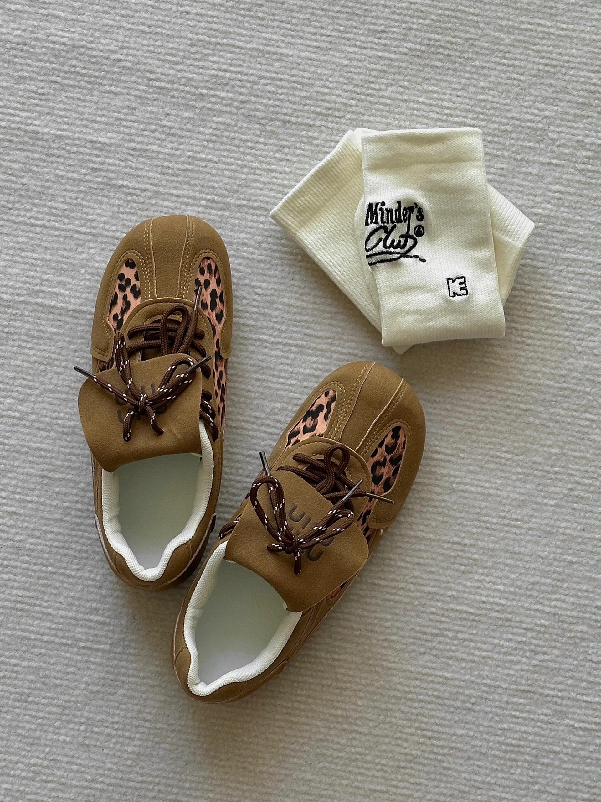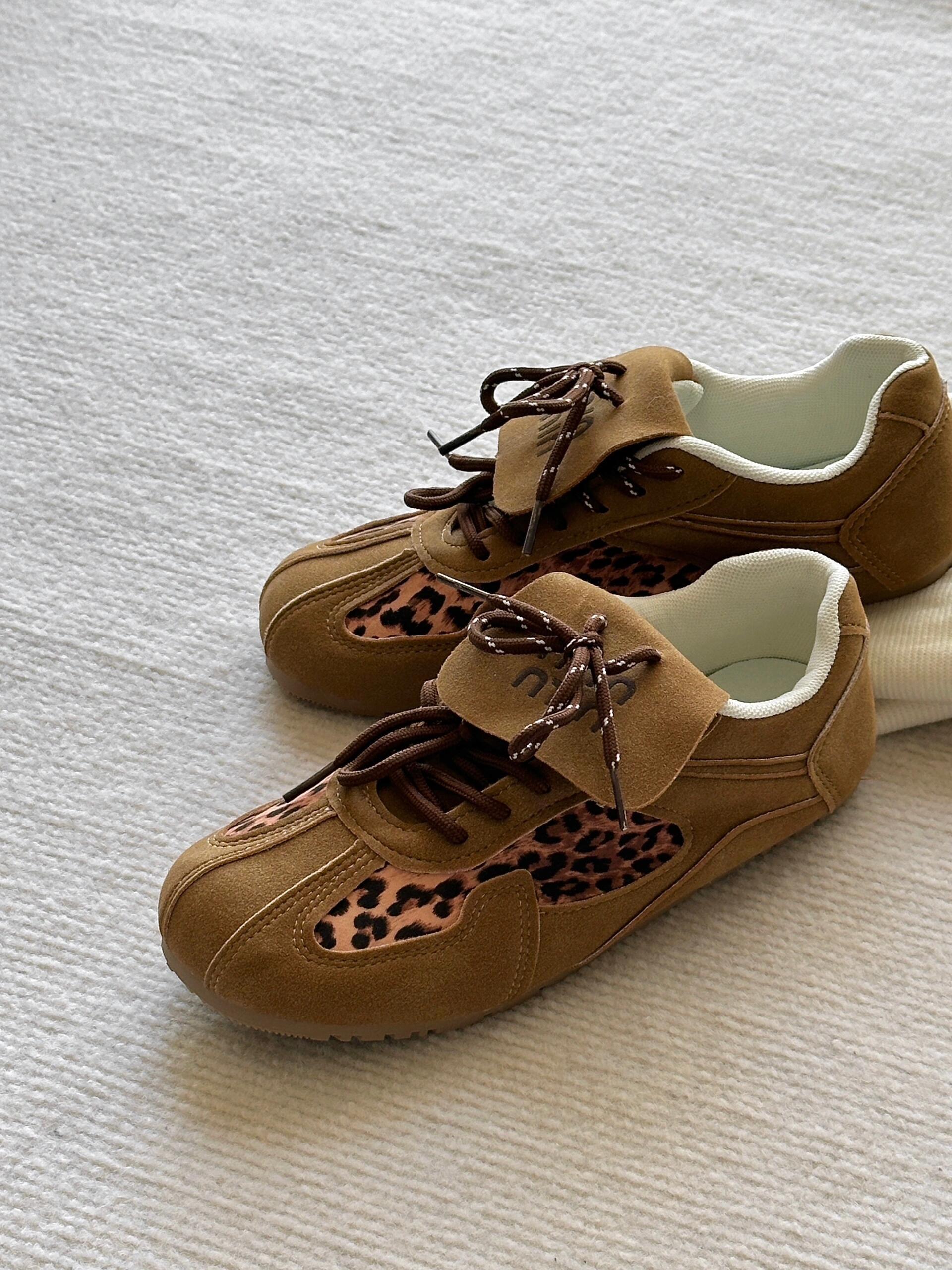 这双豹纹德训鞋是秋日美拉德风的绝配,棕调鞋身搭豹纹装饰,秋日氛围感拉满了。脚感轻便柔软,适配浅灰卫衣+卡其裙的松弛穿搭,自带慵懒时髦感。已经能想象穿它踩枫叶的画面,日常出街或秋游穿着都舒适。